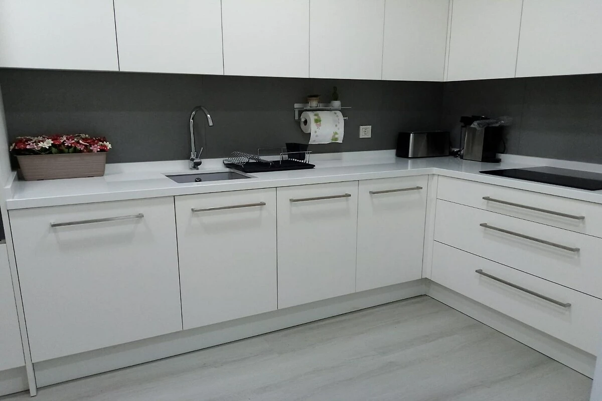 In der 4. Etage: (offene Küche(Kochplatte, Toaster, Kochherd, Kaffeemaschine, Backofen, Mikrowelle, Spülmaschine, Kühl-/Gefrierkombination, Mixer), Wohn/Esszimmer(TV, Esstisch, Sitzecke, Balkon oder Terrasse), Schlafzimmer(Doppelbett), Schlafzimmer(Einzelbett, Einzelbett), Schlafzimmer(Einzelbett, Einzelbett), Badezimmer(Dusche, Waschbecken, Toilette), Badezimmer(Dusche, Waschbecken, Toilette))