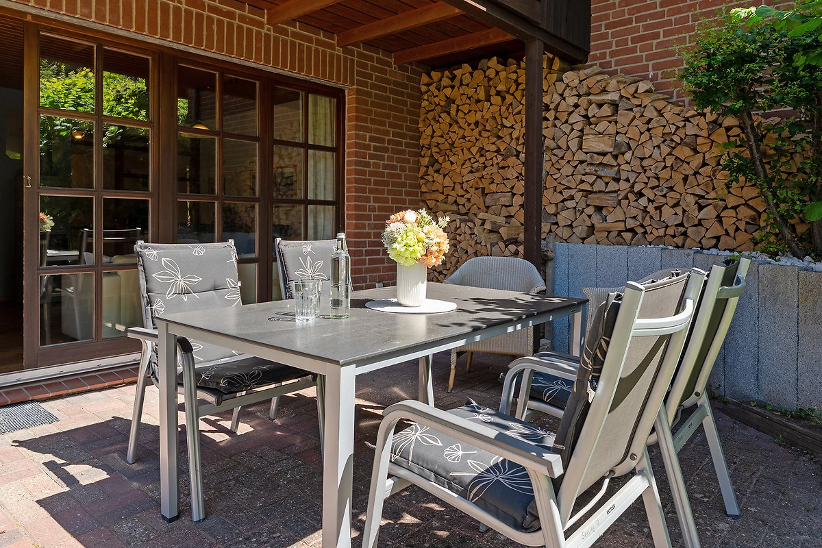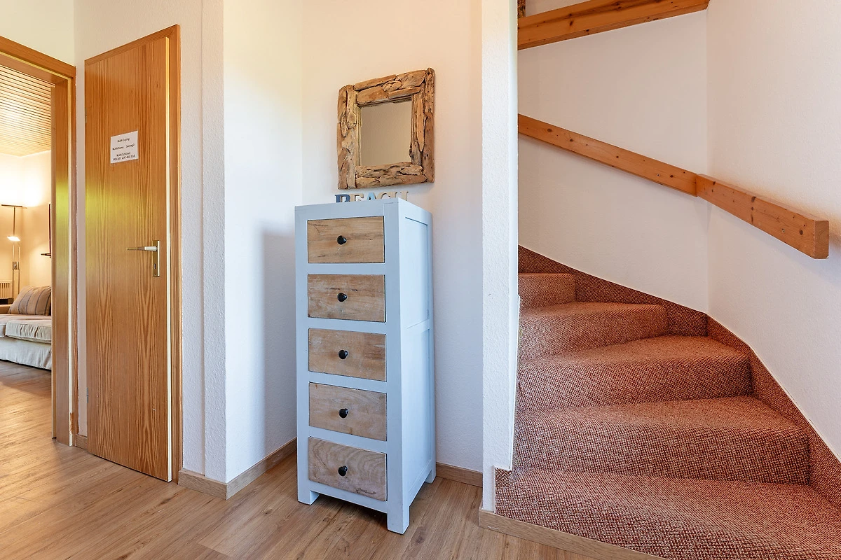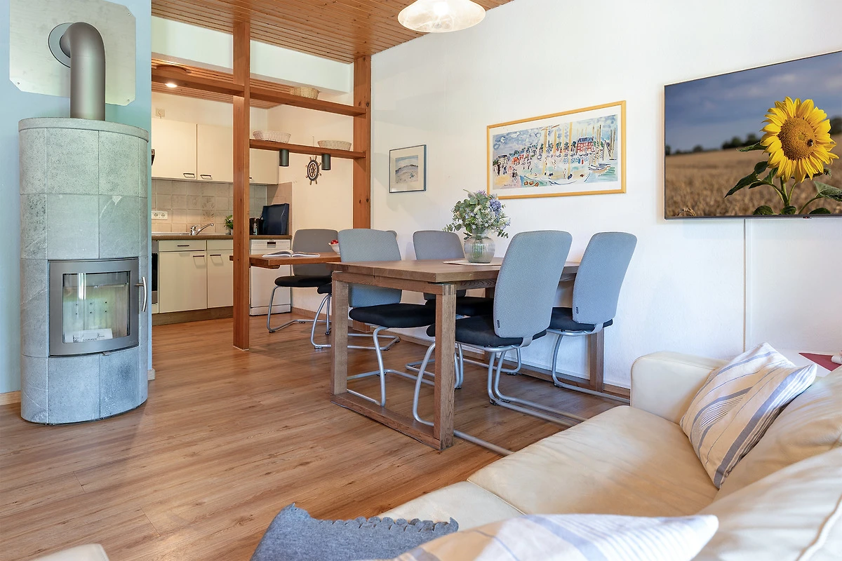 Das charmante Reihenhaus überzeugt mit einem gemütlichen Wohnbereich, der sich über das Erdgeschoss und das erste Obergeschoss verteilt. Liebevolle Details wie nostalgische Sprossenfenster, sichtbare Holzbalken und eine warme Holzdecke schaffen eine behagliche Atmosphäre. Ein Fernseher bietet Unterhaltung, der Kaminofen steht aus Sicherheitsgründen nicht zur Nutzung bereit. Vom Wohnbereich gelangen Sie direkt auf die möblierte Terrasse – perfekt für entspannte Stunden im Freien. Der überdachte Balkon im Obergeschoss lädt ebenfalls zum Verweilen ein.