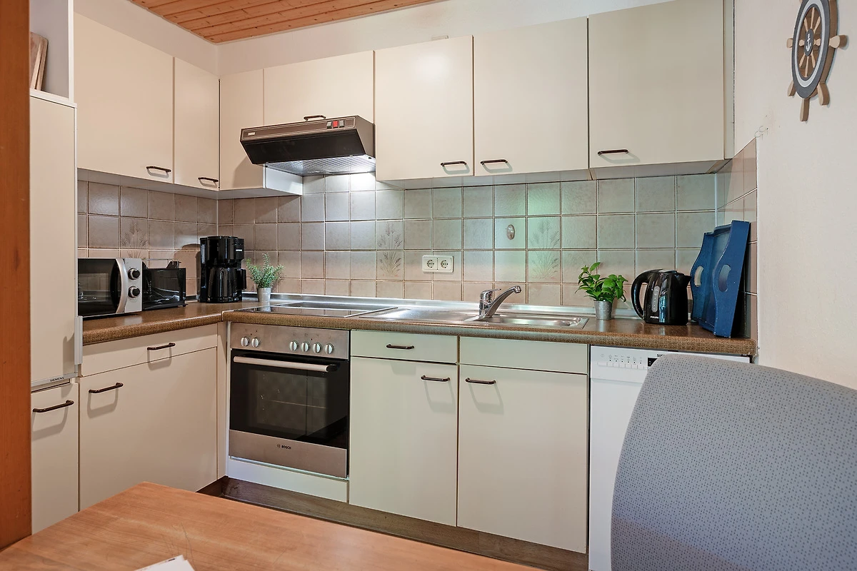 Die Küche ist umfangreich ausgestattet mit Backofen, Mikrowelle, Kaffeemaschine, Geschirrspüler und Ceran-Kochfeld. Der angrenzende Essbereich bietet ausreichend Platz für gemeinsame Mahlzeiten. Zwei Schlafzimmer im ersten Obergeschoss bieten Rückzugsorte für erholsame Nächte.