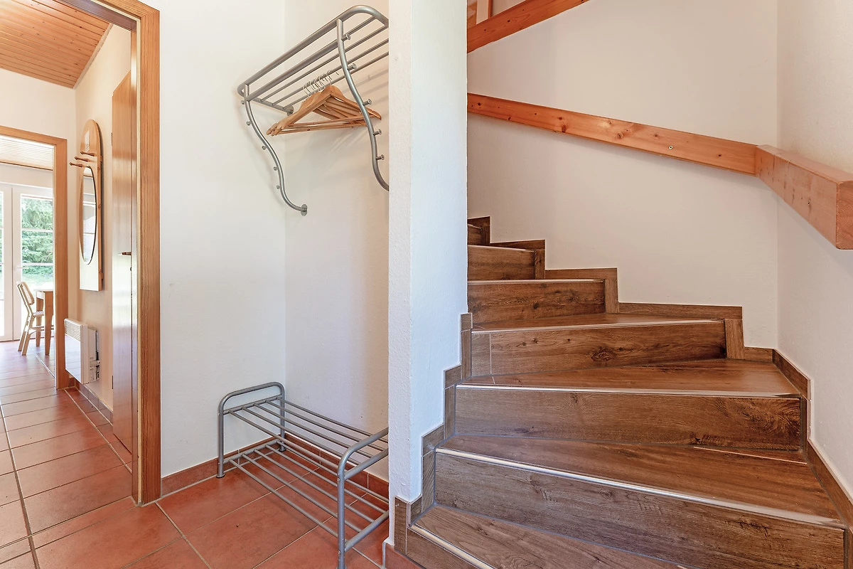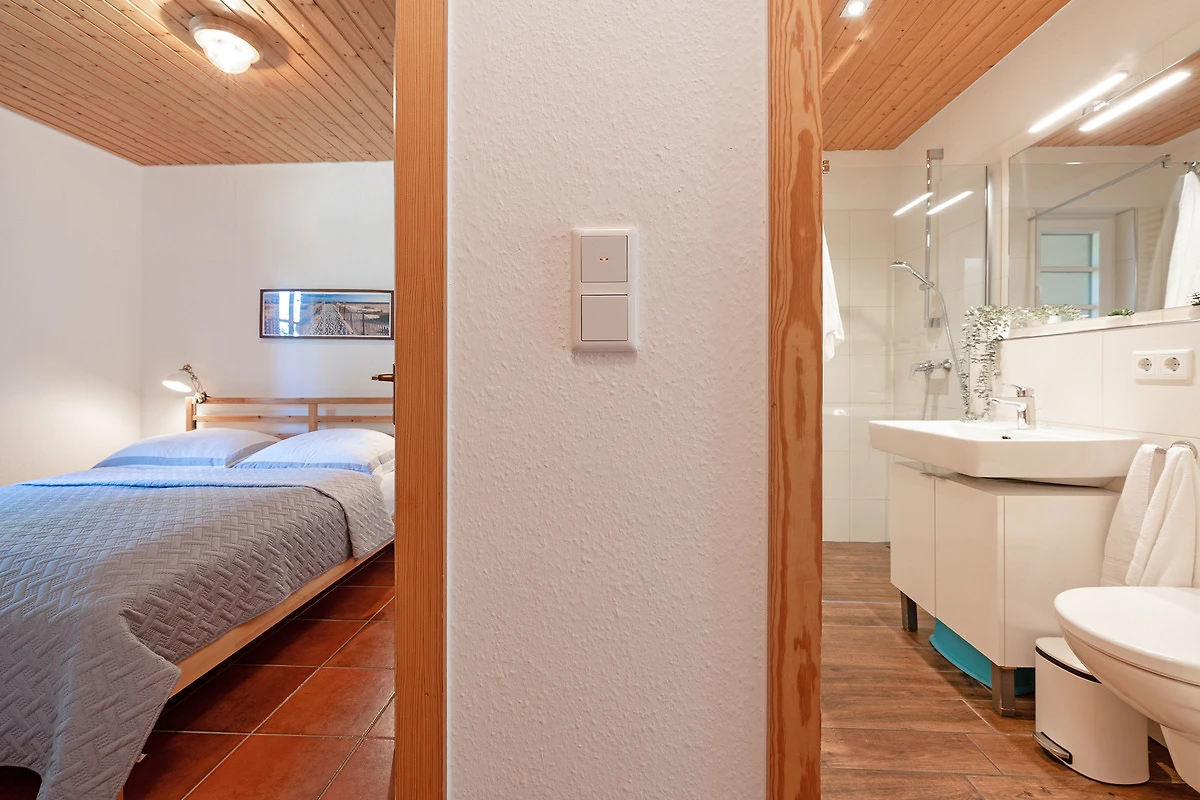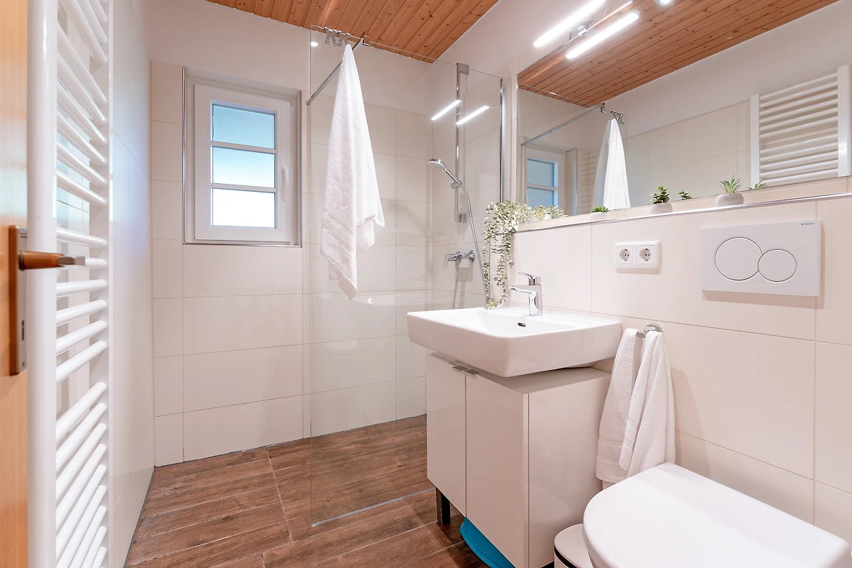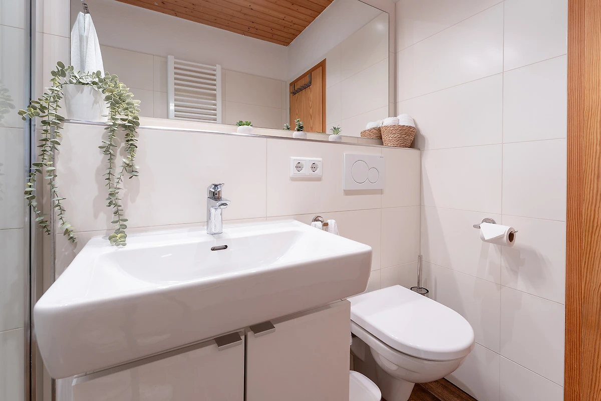 Das helle Tageslichtbad im Erdgeschoss verfügt über Dusche mit Duschwanne und WC. Für Familien stehen sowohl ein Kinderreisebett als auch ein Hochstuhl bereit.