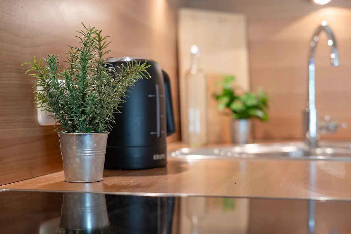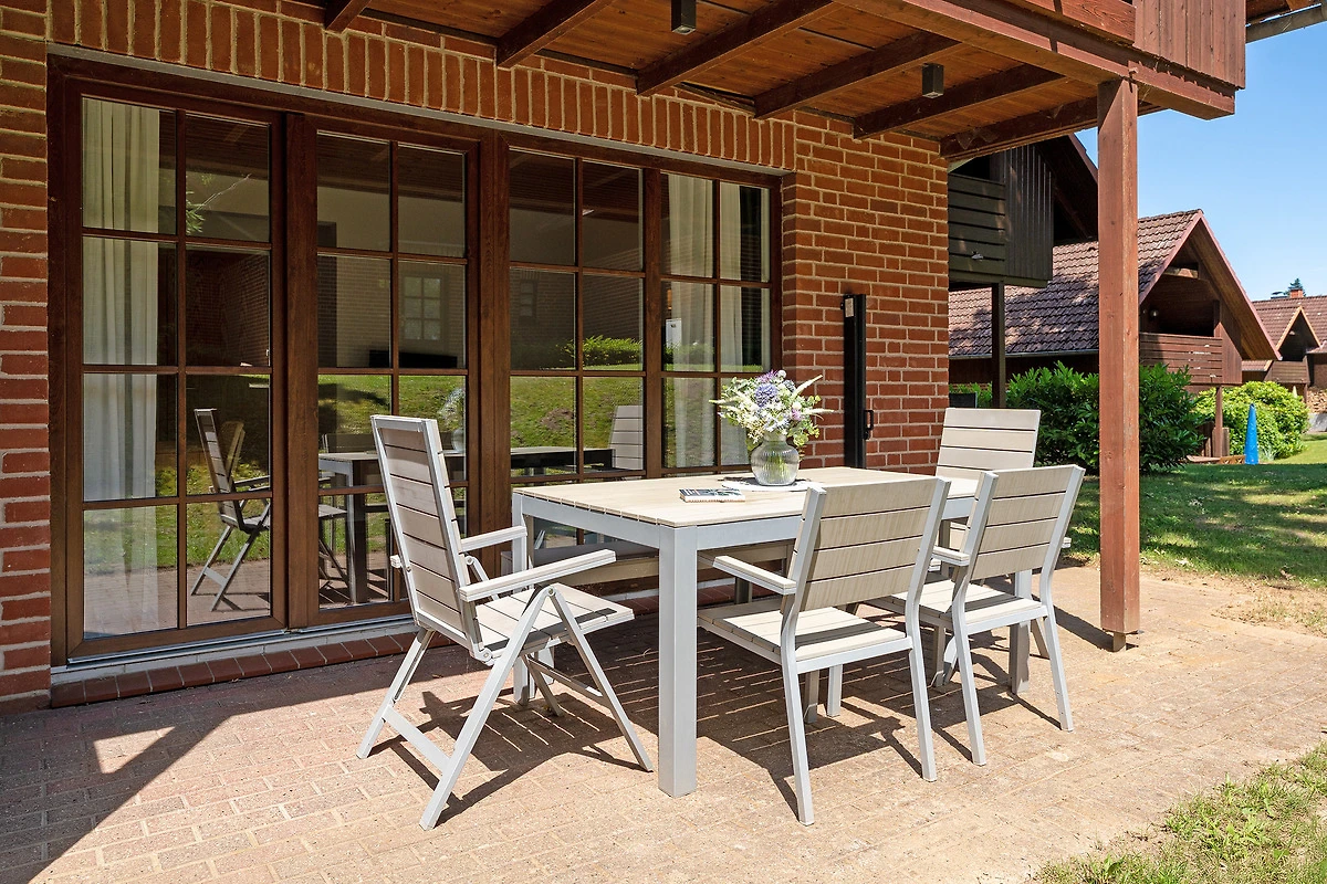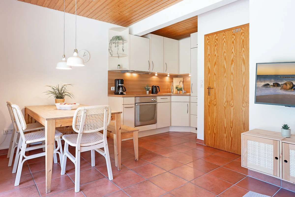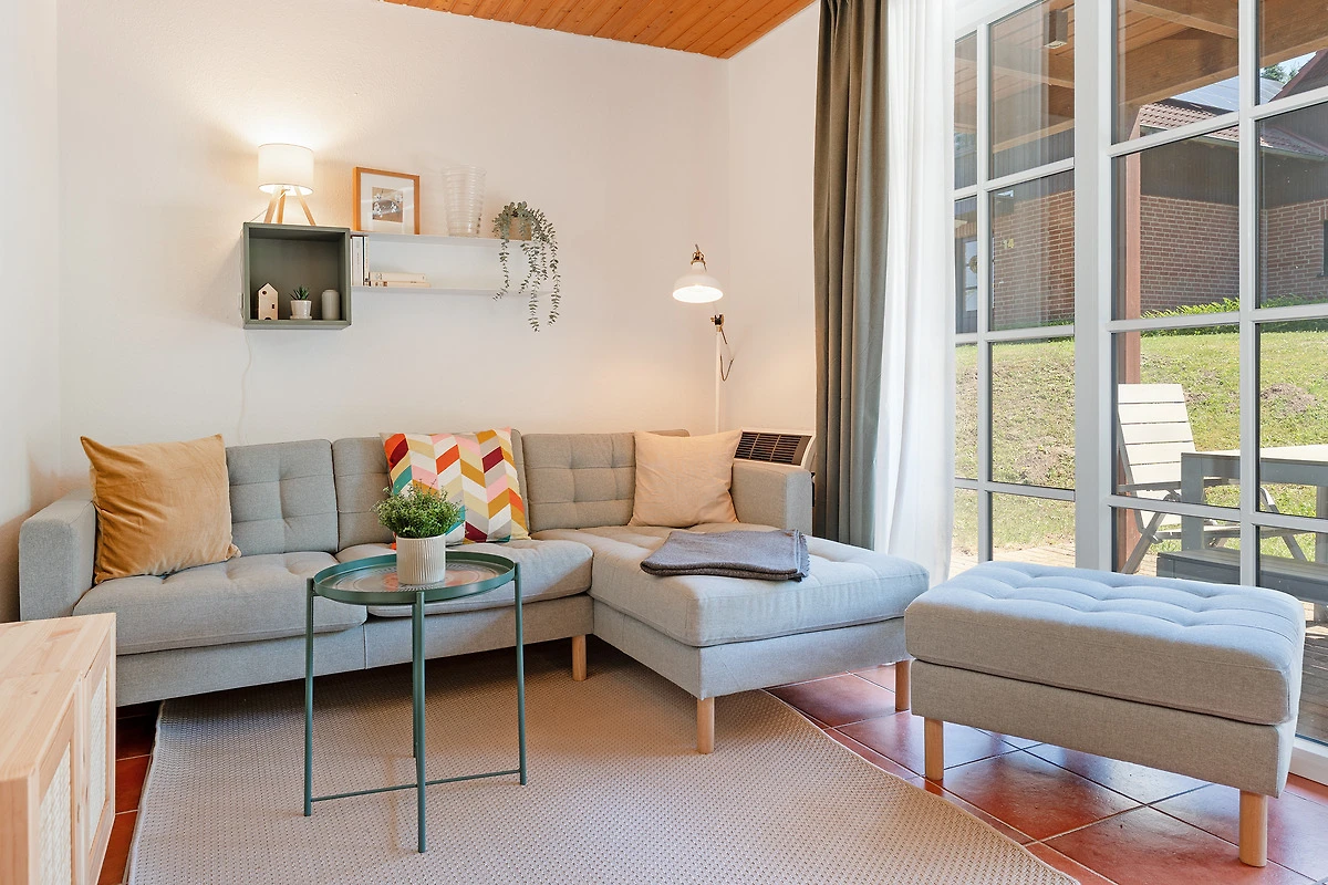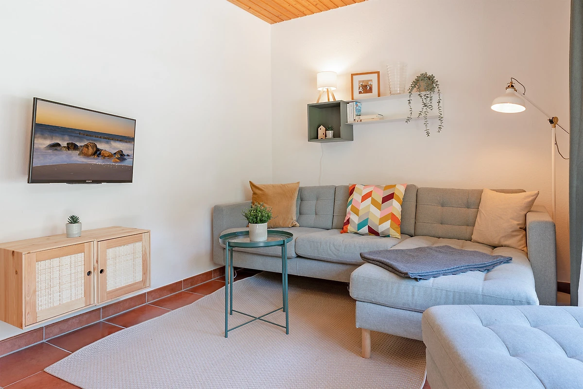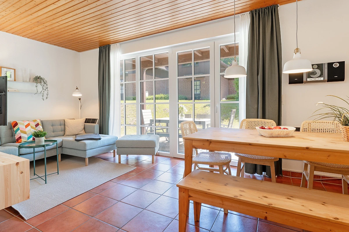 Das charmante Reihenhaus überzeugt mit einem gemütlichen Wohnbereich, der sich über das Erdgeschoss und das erste Obergeschoss verteilt. Liebevolle Details wie nostalgische Sprossenfenster, sichtbare Holzbalken und eine warme Holzdecke schaffen eine behagliche Atmosphäre. Ein Fernseher und ein Radio sorgen für die Unterhaltung. Vom Wohnbereich gelangen Sie direkt auf die möblierte Terrasse – perfekt für entspannte Stunden im Freien.