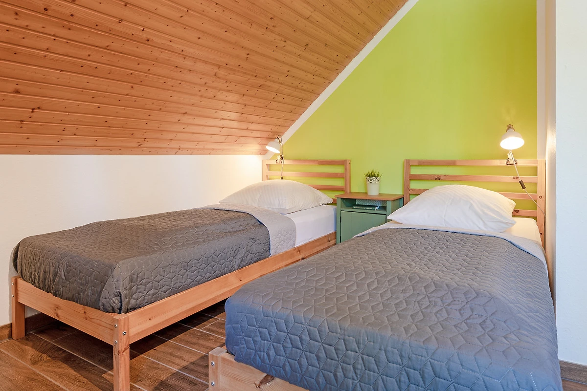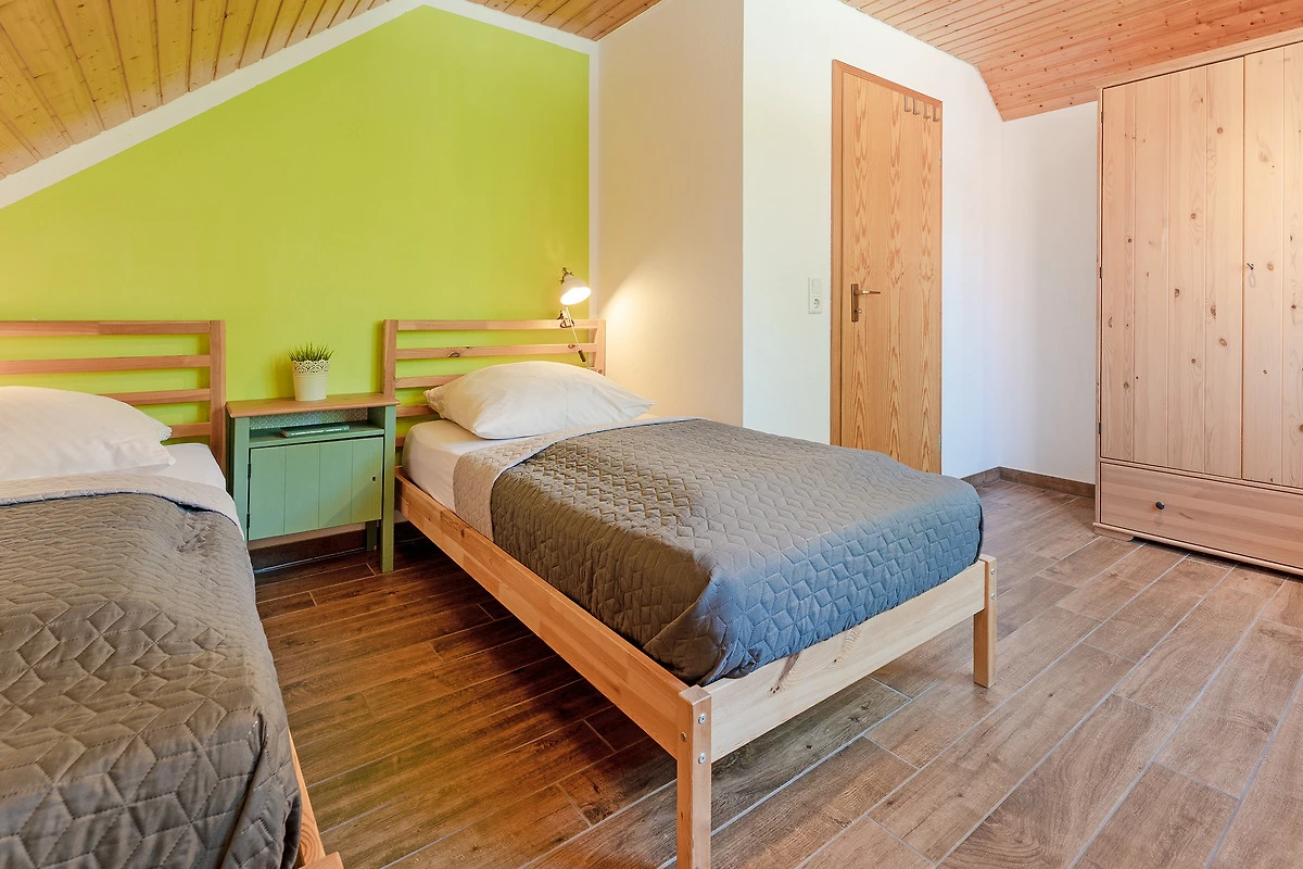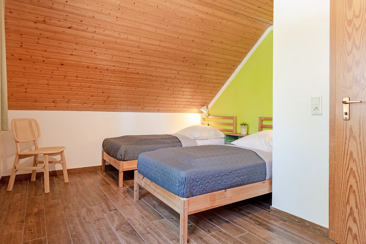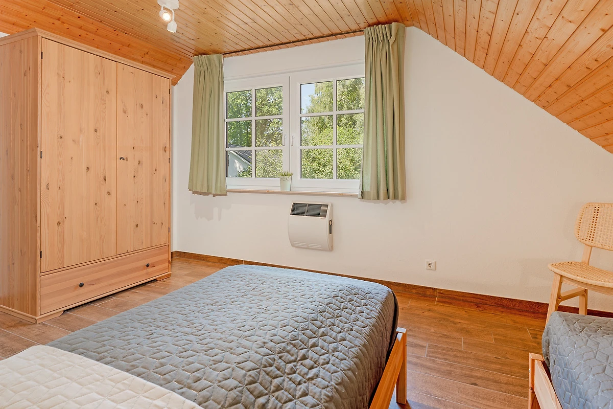 Schlafzimmer 2 (OG): Doppelbett (2x 80x190 cm), Verdunkelung: Vorhänge, Platz für Babybett vorhanden