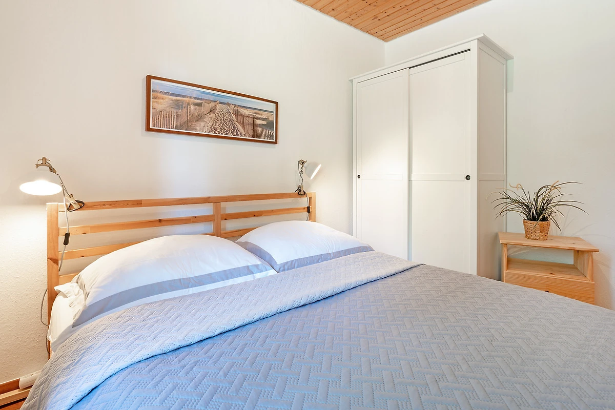 Schlafzimmer 1(EG): Doppelbett (2x 80x190 cm), Kleiderschrank, Verdunkelung: Vorhänge
