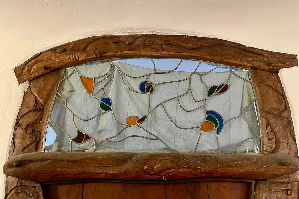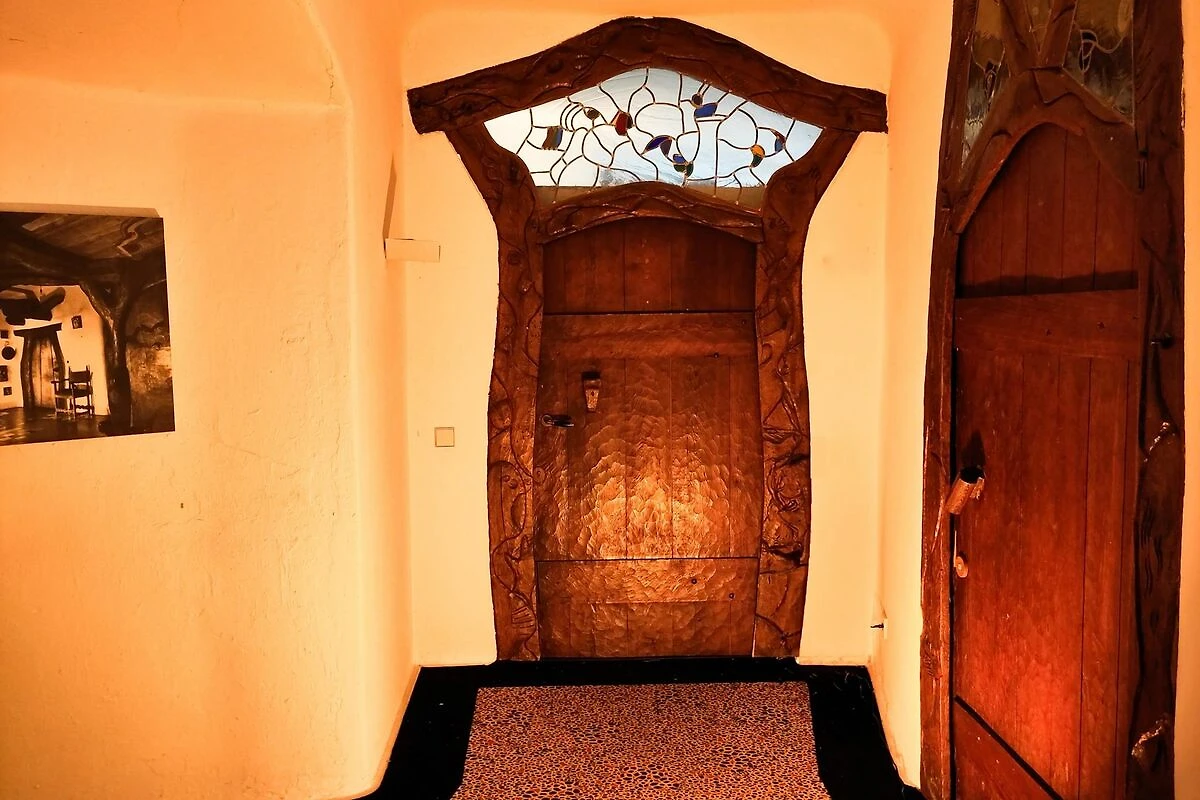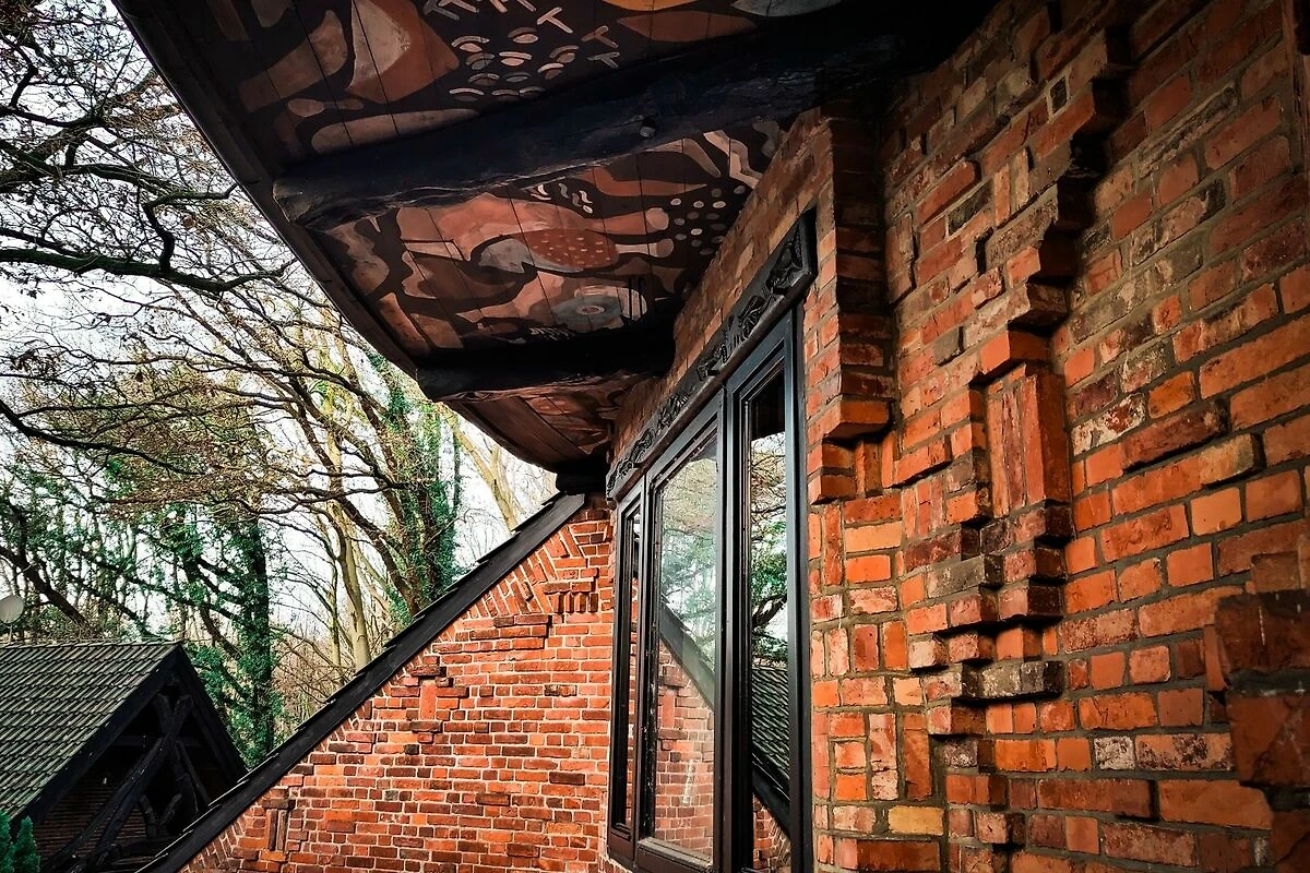 Türreliefs, Deckenmalereien, skulpturale Holzbalken: Original erhaltene Gestaltungselemente beleben den Charakter des expressionistischen Hauses, das Hoetger 1922 baute. Wandeln Sie auf Hoetgers Spuren und erleben Sie die Harmonie zwischen Kunst und Natur in dieser einzigartigen Unterkunft!
