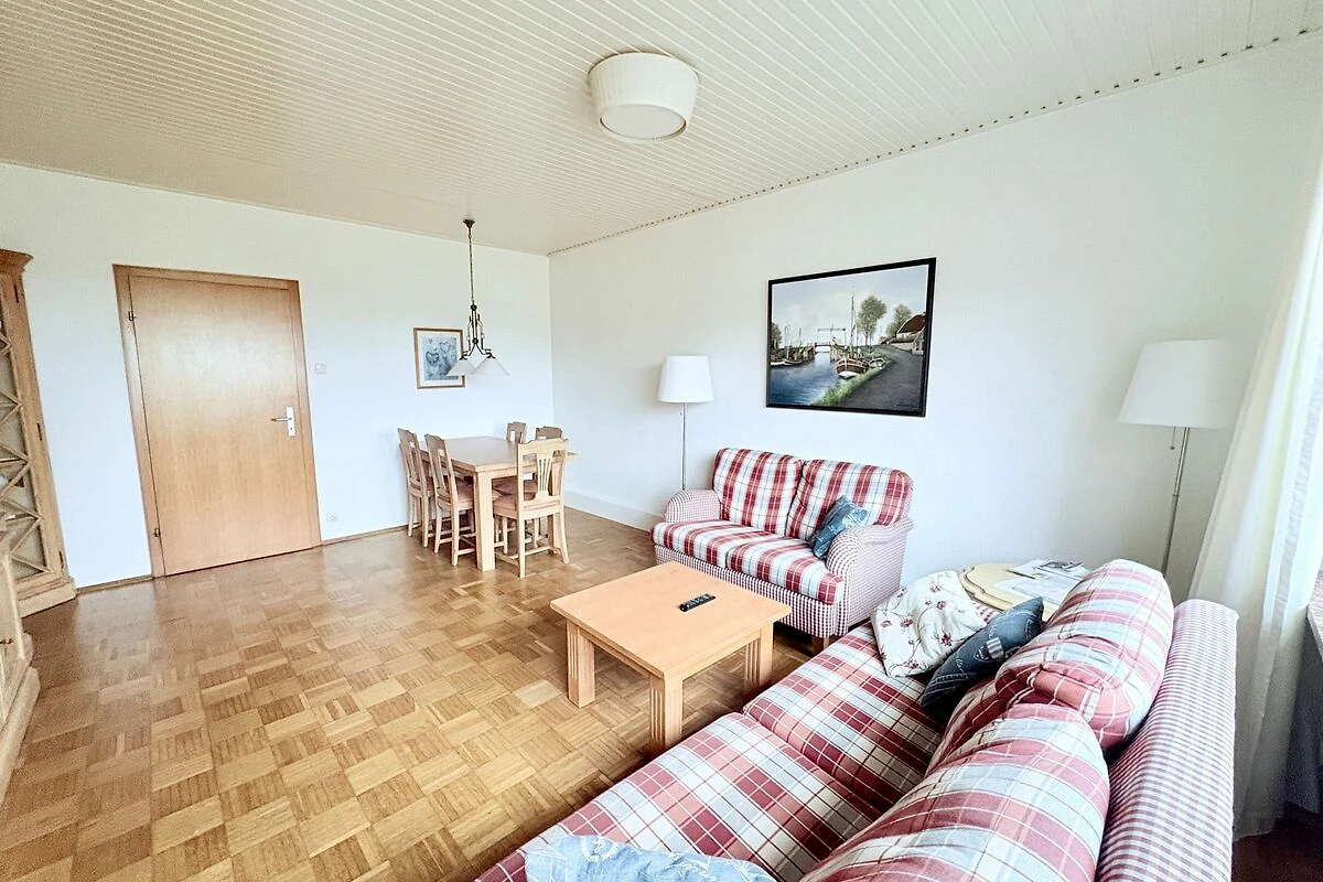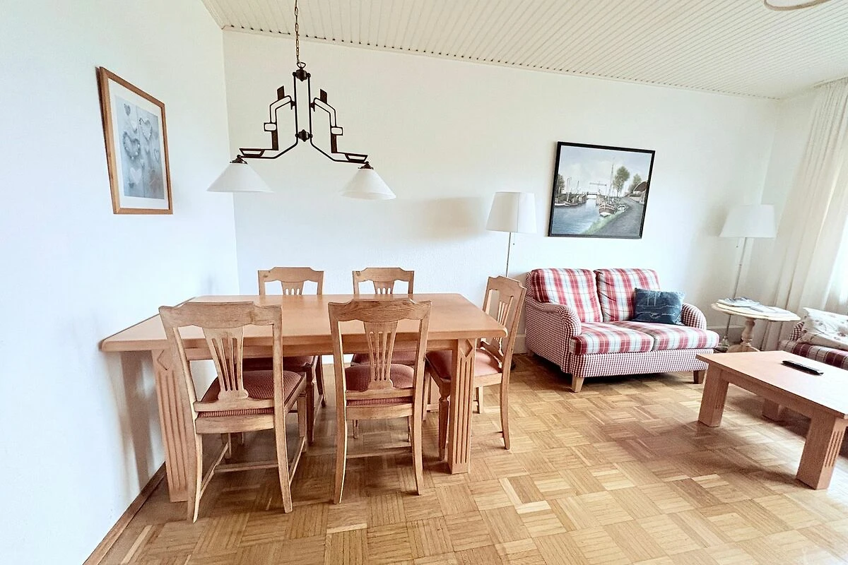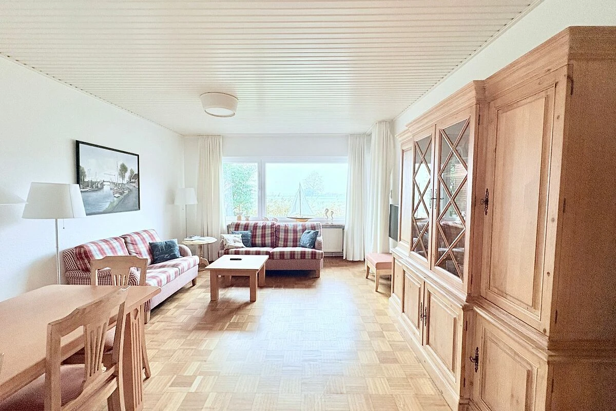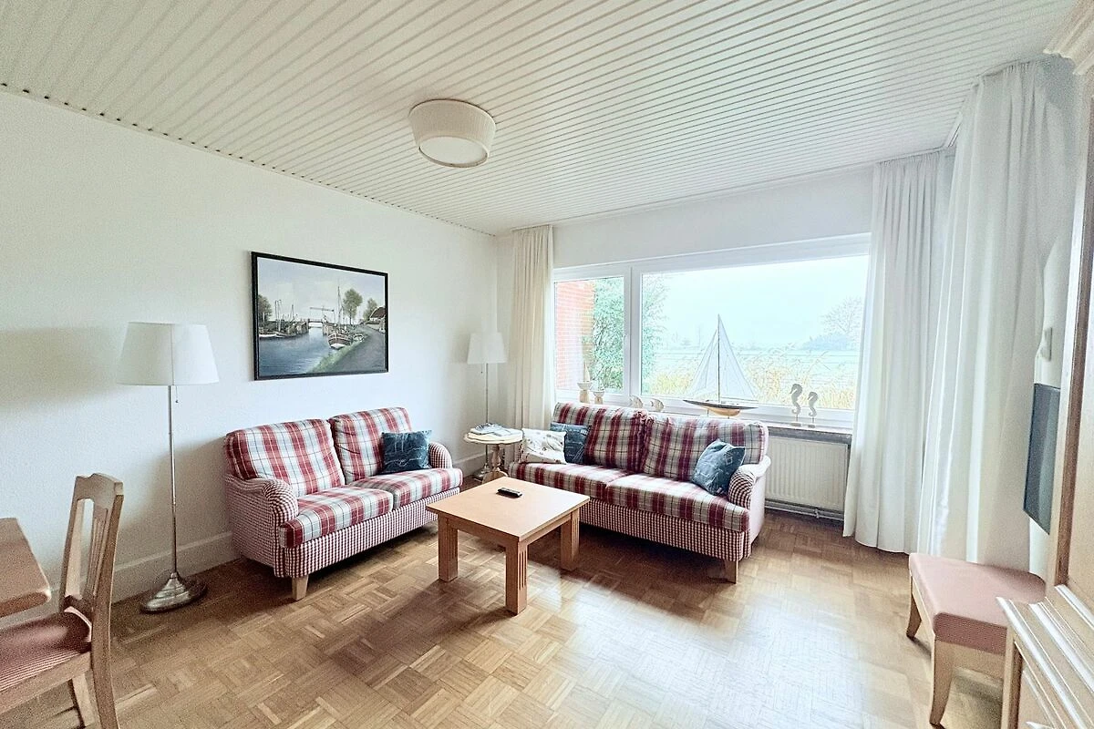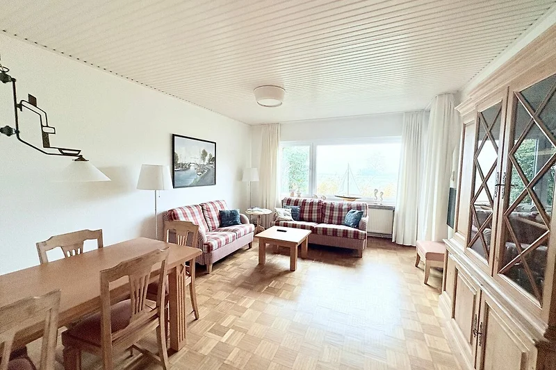 Im Wohnzimmer finden Sie einen weiteren Esstisch sowie einen Flachbildfernseher und zwei gemütliche Sofas. Durch die grossen Fenster ist das Wohnzimmer sehr hell. Über das Wohnzimmer gelangen Sie auf die Terrasse, von der aus Sie ebenfalls einen atemberaubenden Blick über die Felder und den Deich geniessen können der ideale Ort, um den Sonnenuntergang zu beobachten oder einfach nur die Natur zu geniessen.