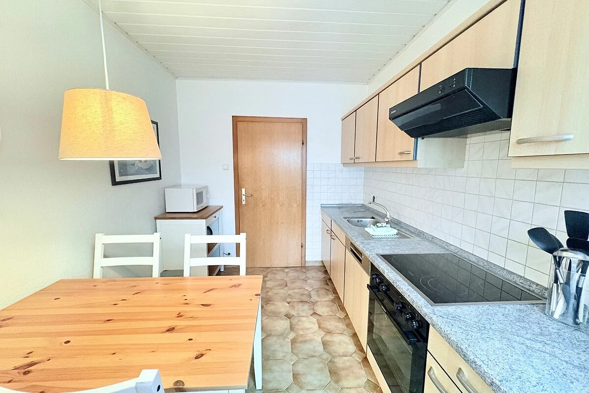 • Gut ausgestattete Küche mit Esstisch, Mikrowelle, Toaster, Wasserkocher und Kaffeemaschine, Backofen, E-Herd, Kühlschrank