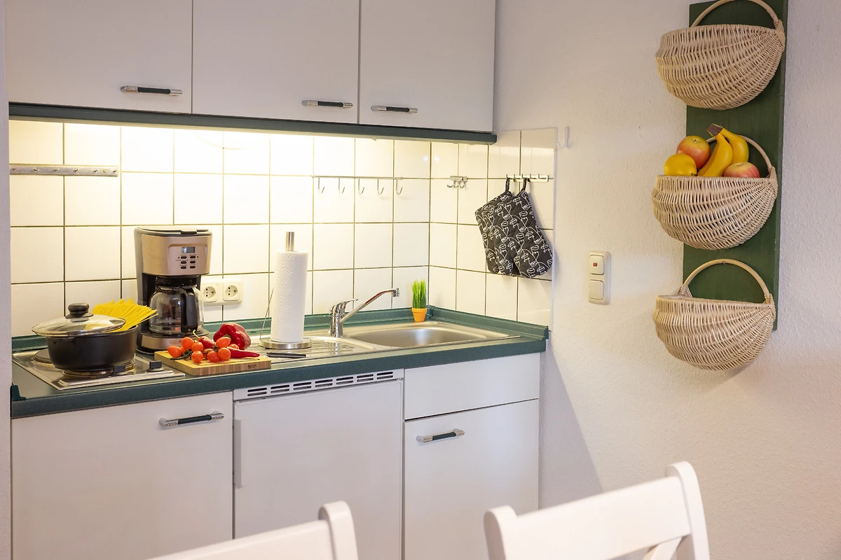 • Komplett ausgestattete Küche mit Mini Backofen, Mikrowelle, Kühlschrank, Geschirr und Besteck - ideal für gemeinsame Kochabende