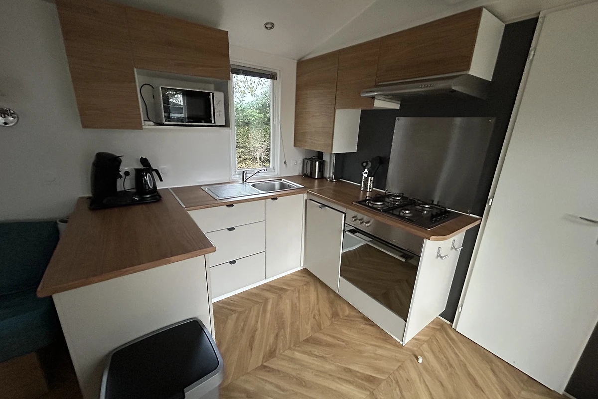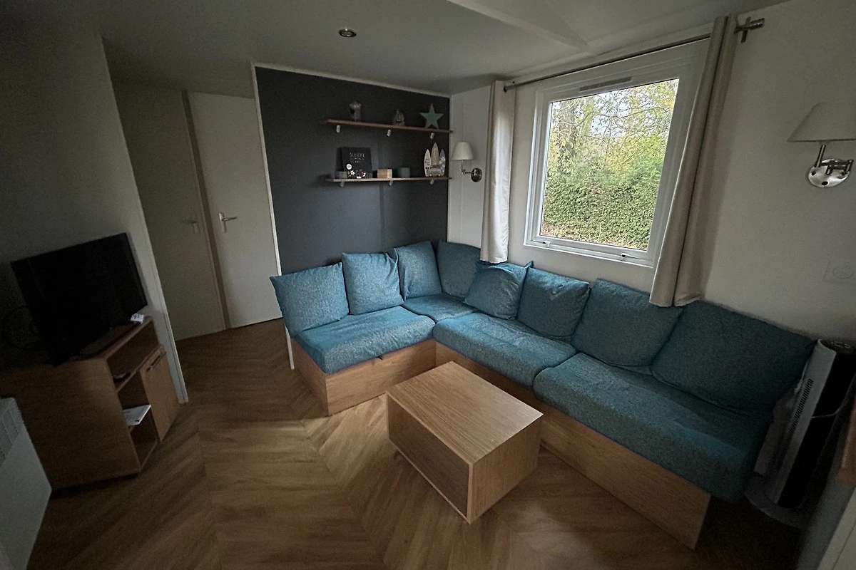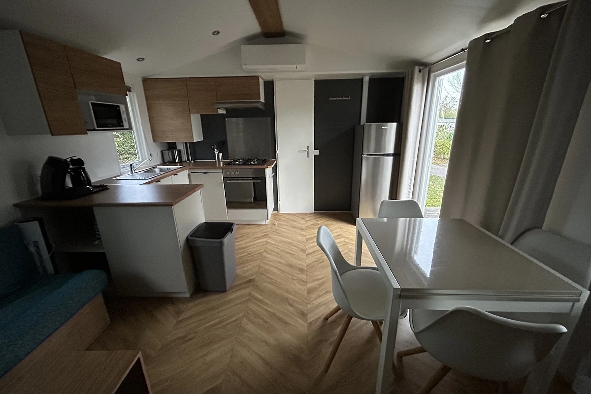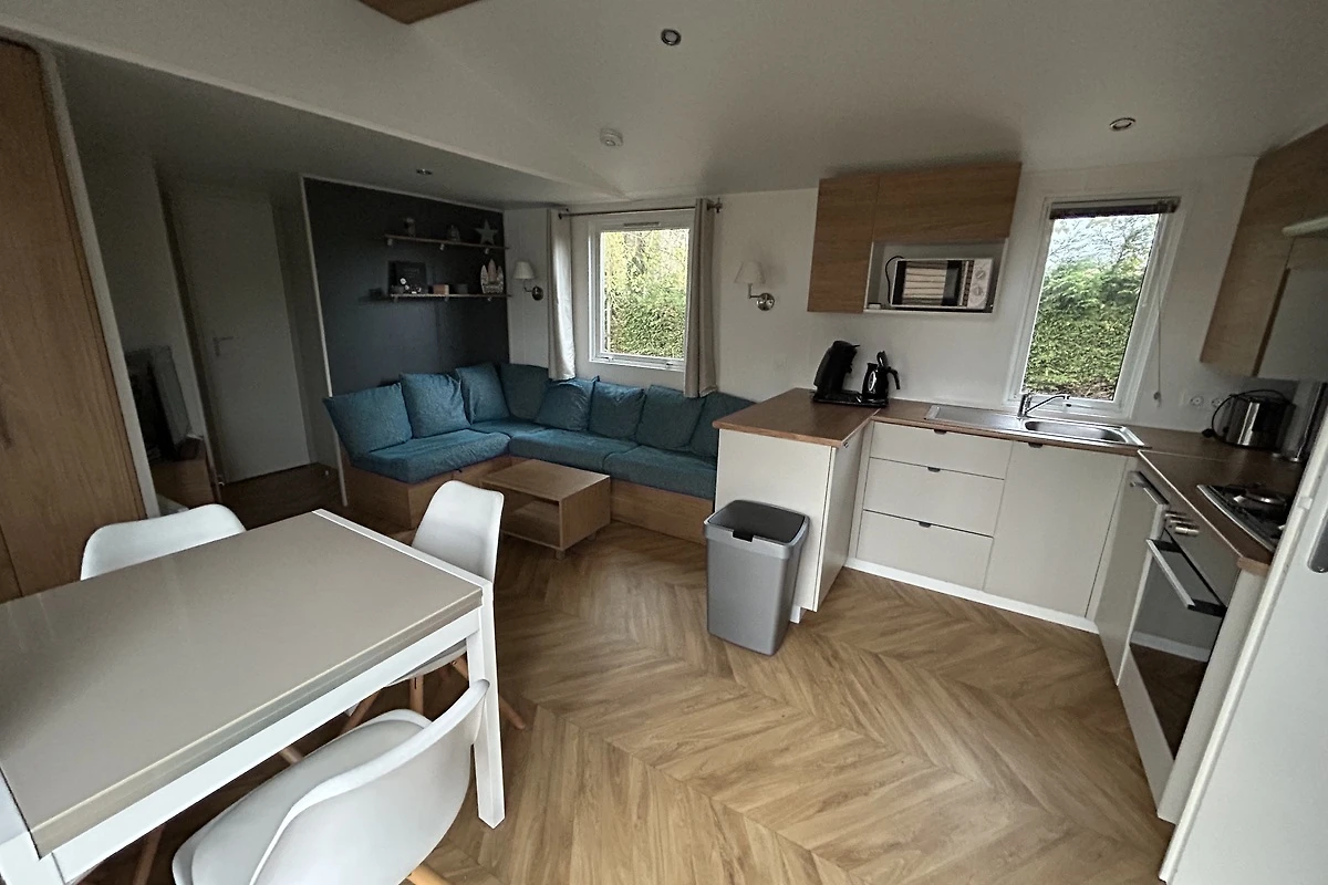 Der Wohnraum besticht durch seine gemütliche Couch und seine gut ausgestattete Küche mit Esstisch.