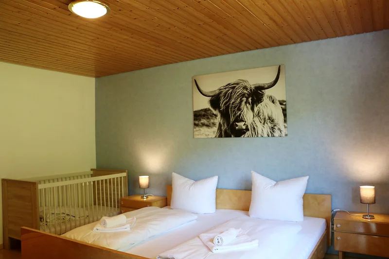 - ein Schlafzimmer einem Doppelbett (180x200), einem Babybett und Zugang zum Balkon