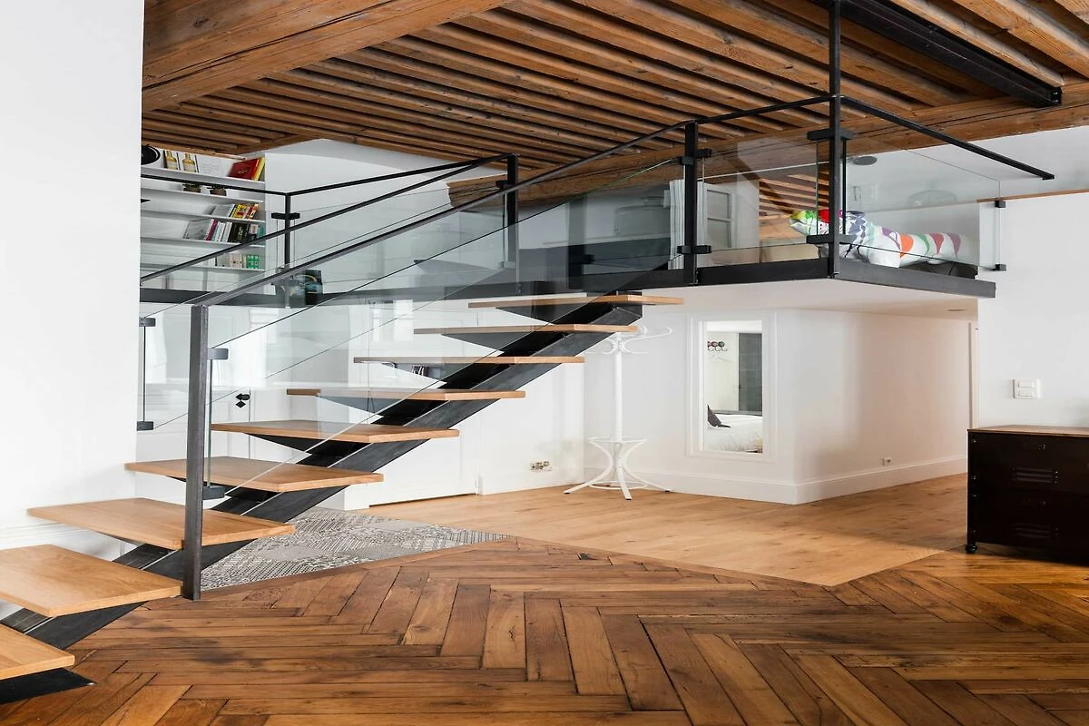 Zwischengeschoss: (Wohnzimmer(Doppelschlafcouch, TV(Flatscreen)), offene Küche(Esstisch, Herd, Wasserkocher, Toaster, Kaffeemaschine, Backofen, Mikrowelle, Kühlschrank, Hochstuhl, , , Baking sheet, Wine glasses), Schlafzimmer(Einzelbett, Einzelbett, Doppelschlafcouch))