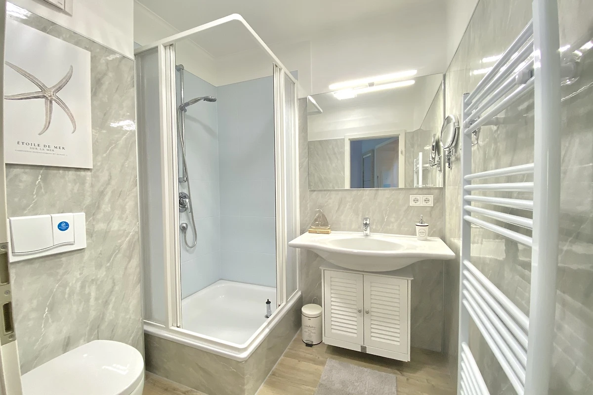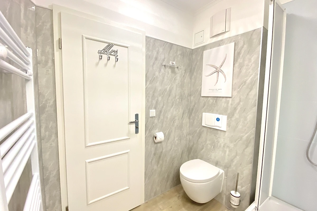 Im Appartement finden Sie ein Bad mit Dusche und WC, Haartrockner und Kosmetikspiegel,