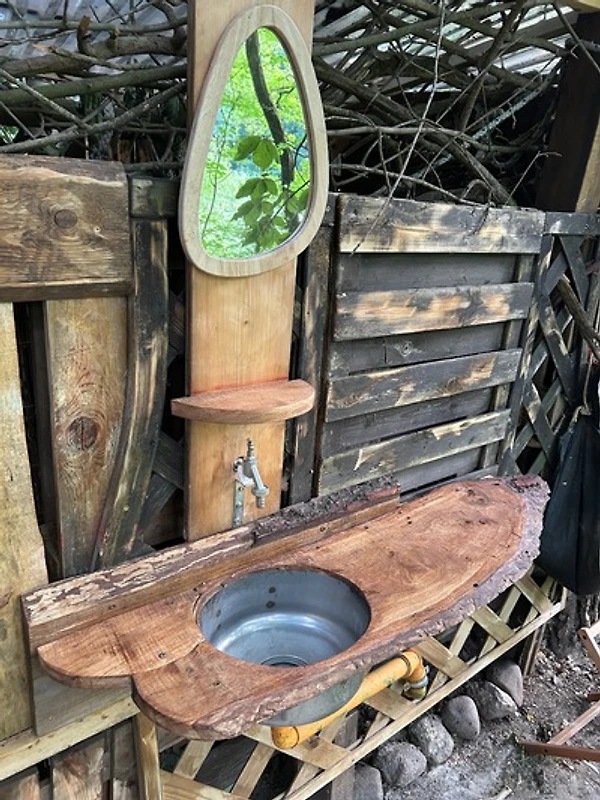 Im Moment ist vieles an Bord noch wie zu Zeiten auf der Havel, es hat sich eine Menge getan. Die Zeiten der Campingtoilette sind vorbei!!! Wir haben direkt neben das Floss ein kleines Natur-Sanitärhaus mit Pissoir, Dusche und einer zeitgemässen Trockentoilette gebaut, an dessen Rückseite sich dann ein multifunktionaler befindet (wie man will - Freiluftküche oder Frisiertoilette ;) - jedenfalls mit einem vernuenftigen Handwaschbecken mit fliessendem Trinkwasser und einer Anrichte. Das Sanitärsystem ist ökologisch durchdacht....