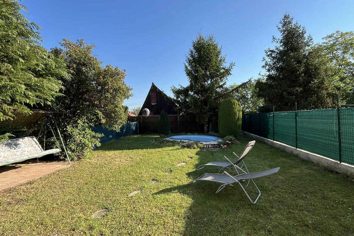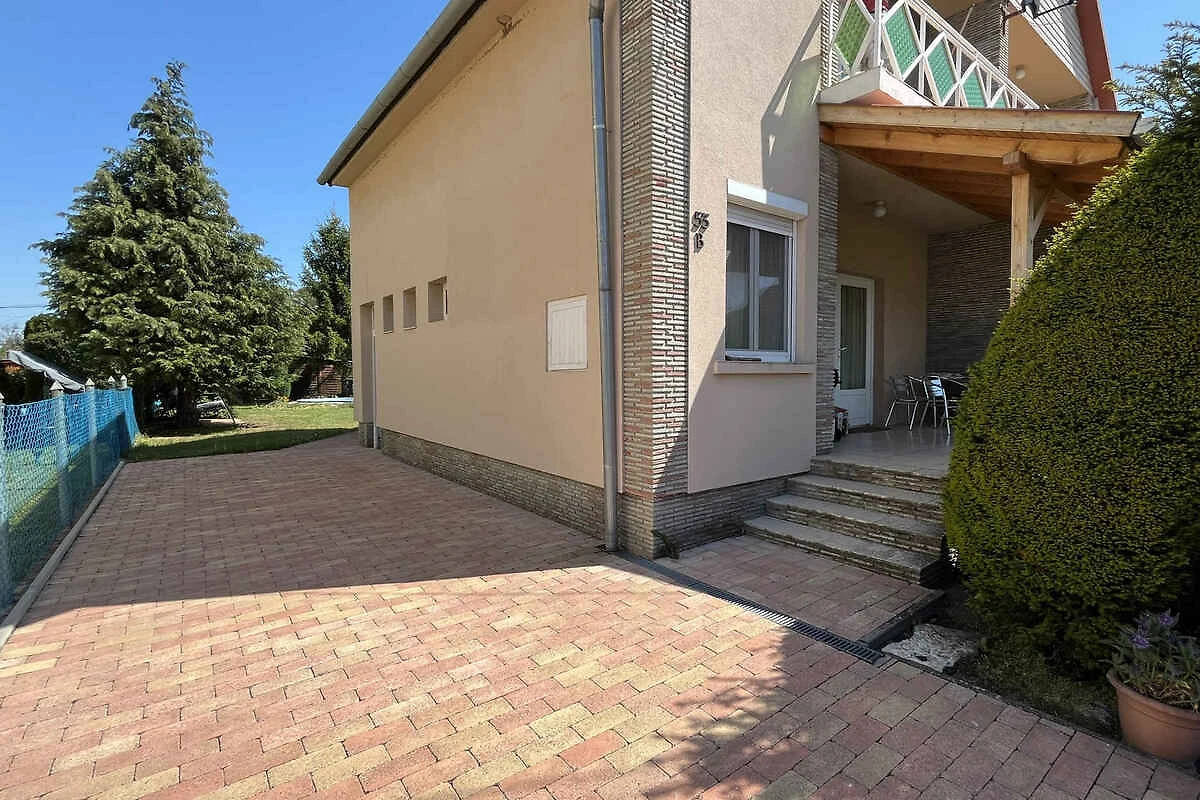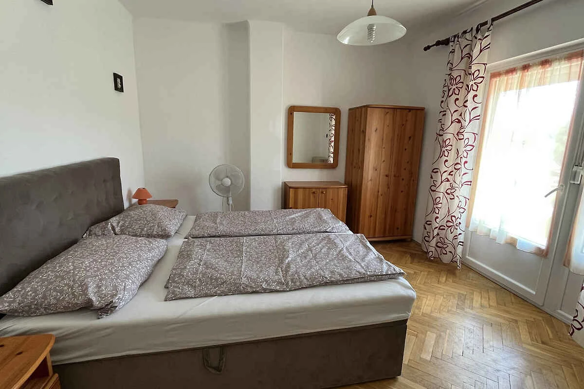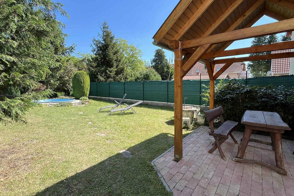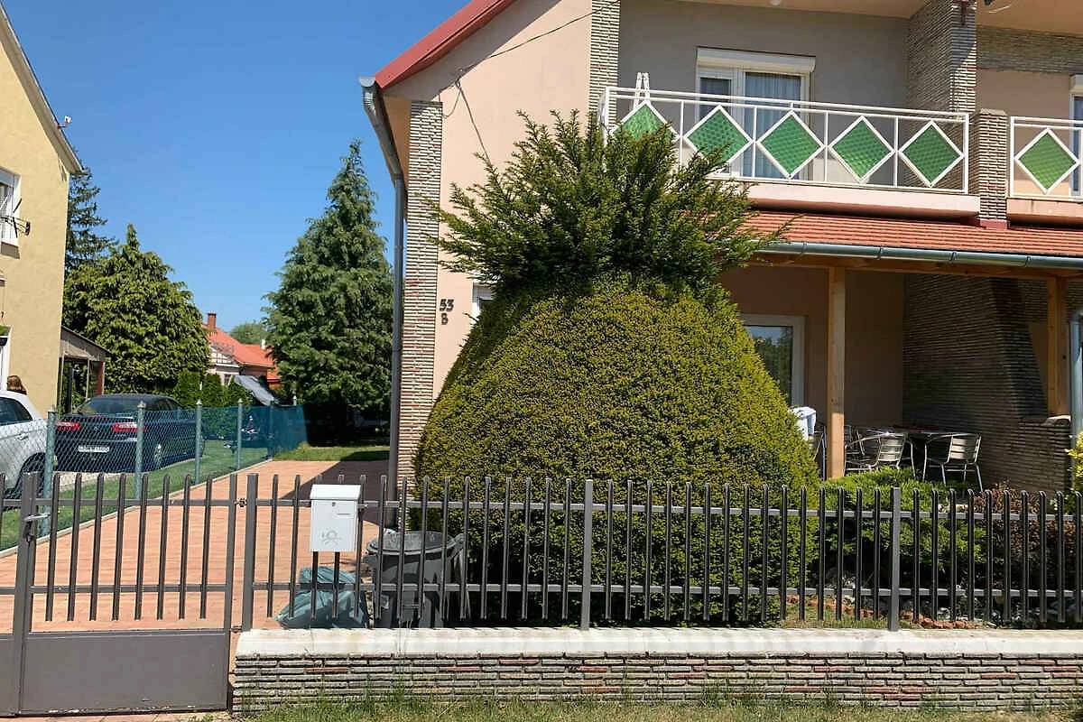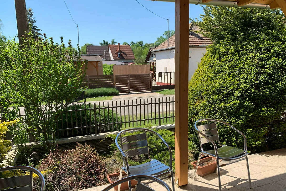 Balatonmáriafürdő. Das Ferienhaus befindet sich auf einem geschlossenen Gartengrundstück mit Wiese und Bäumen, von einem Zaun begrenzt. Der Vermieter wohnt nicht im Haus oder auf dem Grundstück. Die Zufahrt erfolgt über eine Nebenstrasse (asphaltiert). Parkplatz (für 2 Pkws) auf dem Grundstück.
