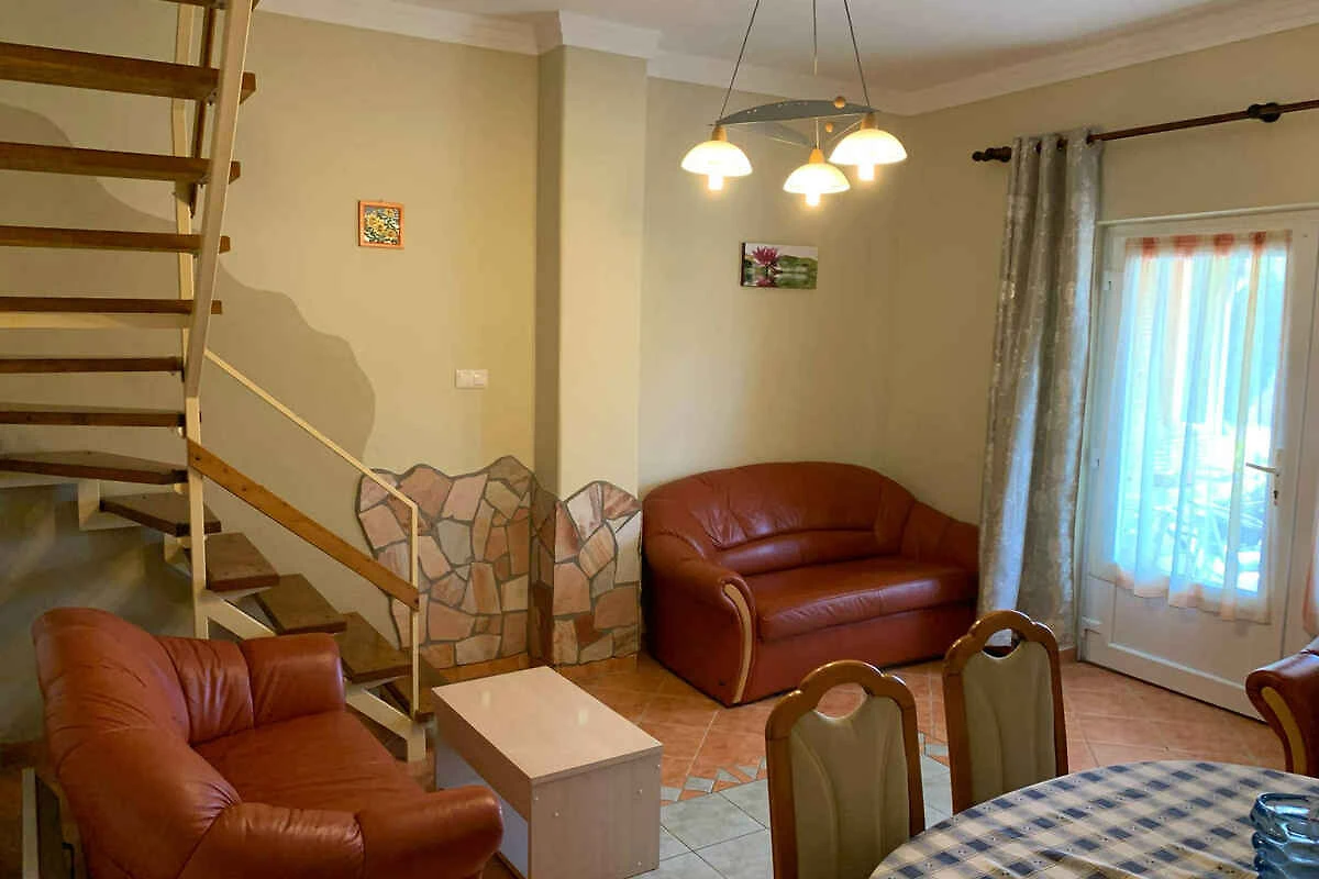 Erdgeschoss: Wohnzimmer mit Sitzecke, TV, Essecke (4 Plätze) und Zugang zur Terrasse. Küche mit Gasherd (3 Flammen), Backofen, Kühlschrank (Eisfach), Mikrowelle und Kaffeemaschine. Bad mit Badewanne, 1 Waschbecken, WC und Fenster.