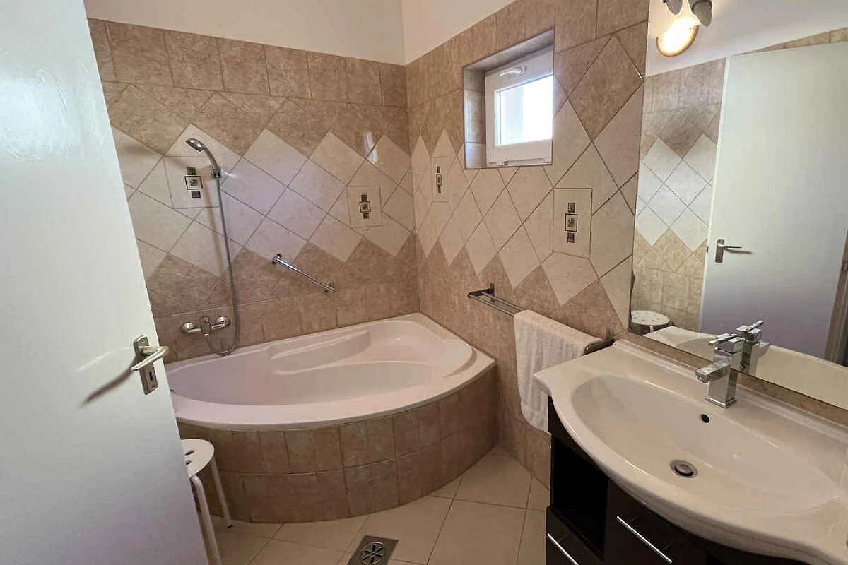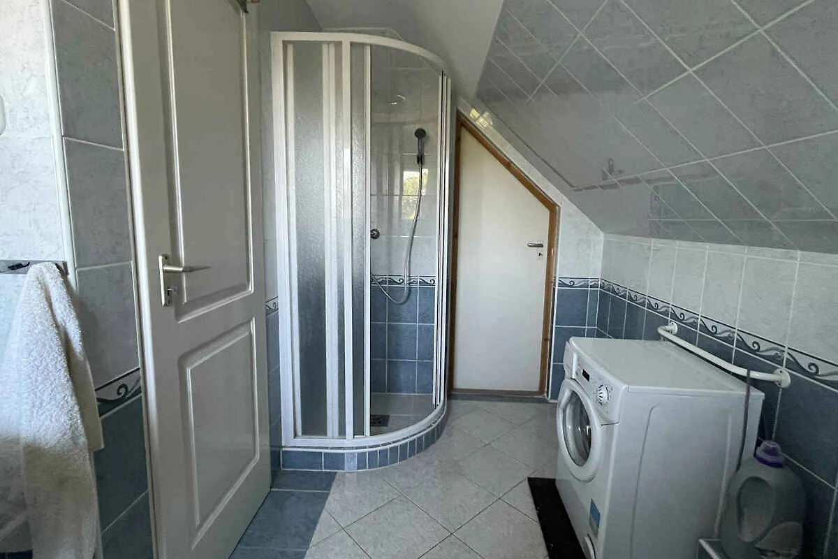 Dachgeschoss: Bad mit Waschmaschine, Dusche, 1 Waschbecken, WC und Fenster. Schlafzimmer mit 2 Einzelbetten. Schlafzimmer mit 1 Doppelbett und (5 qm, Gartenmöbel, 1 Tisch, 2 Stühle). mit (10 qm, überdacht, Gartenmöbel, 1 Tisch, 6 Stühle).