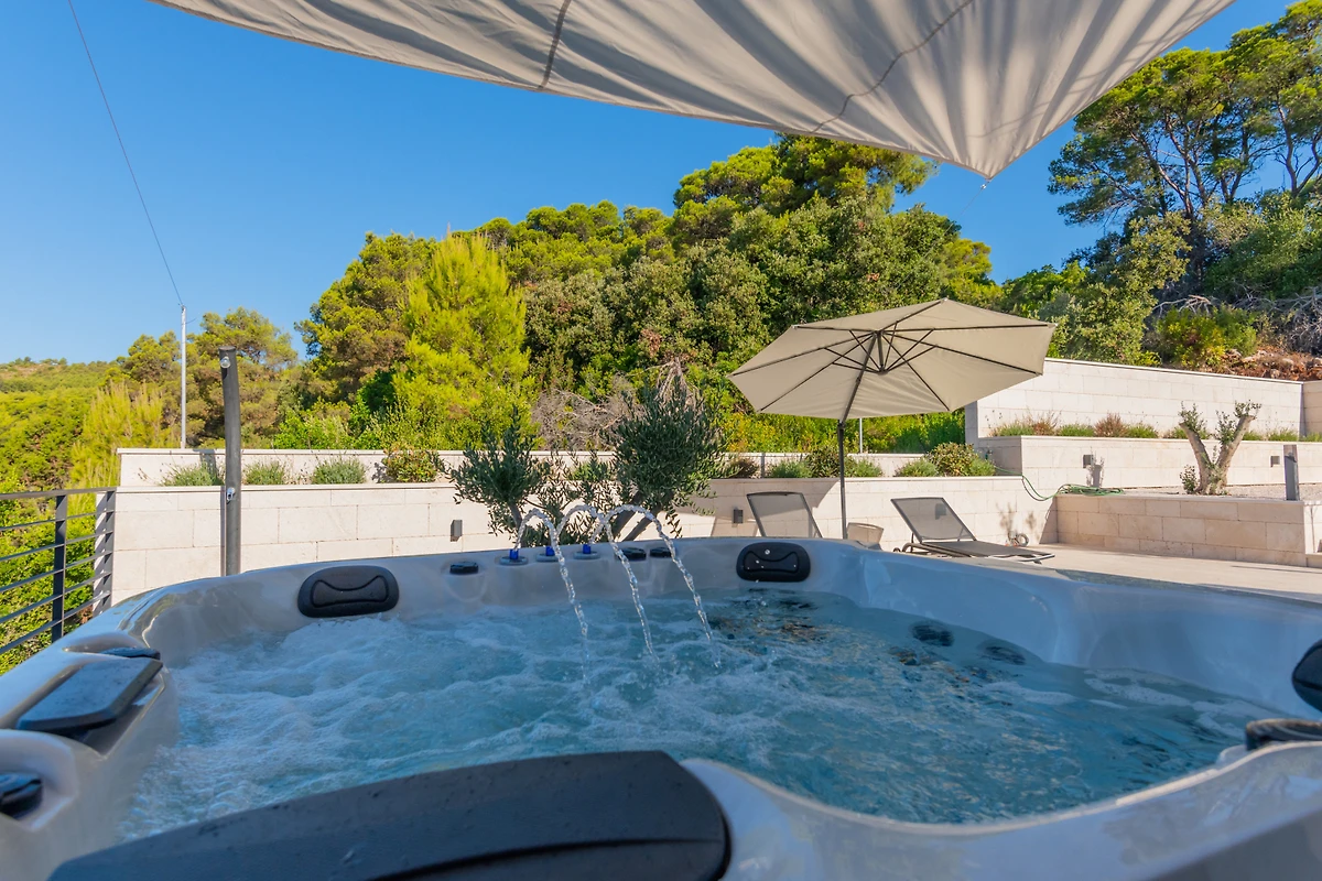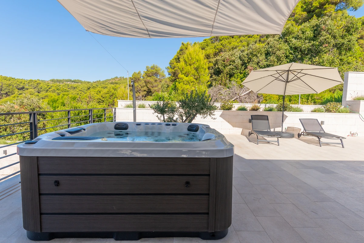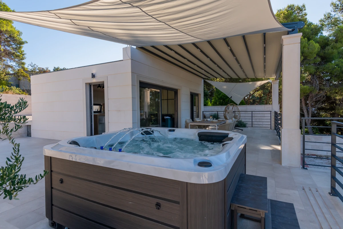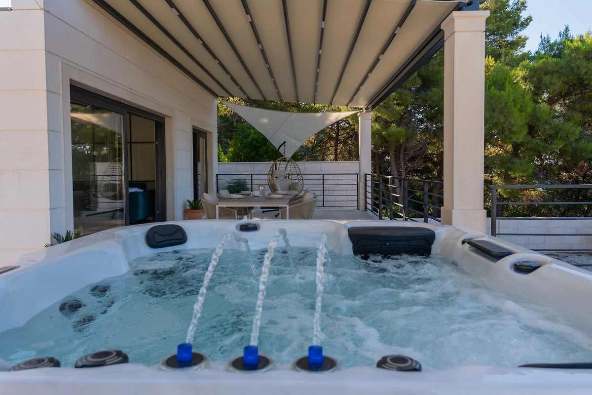 Ein besonderes Highlight ist der private Whirlpool, perfekt zum Entspannen nach einem Tag voller Erkundungen. Die Villa verfügt über ein Badezimmer mit Dusche und sorgt so für Komfort und Bequemlichkeit. Zwei private Aussenparkplätze stehen direkt auf dem Grundstück zur Verfügung.
