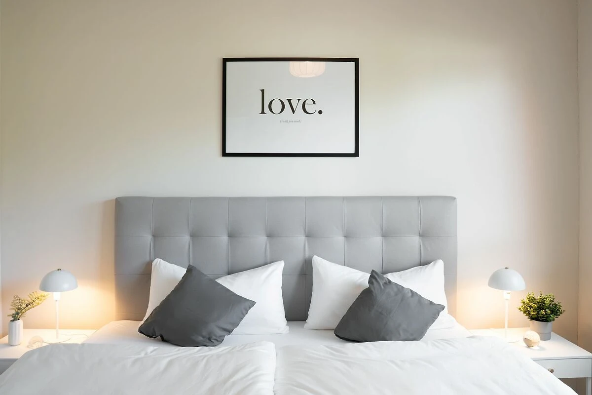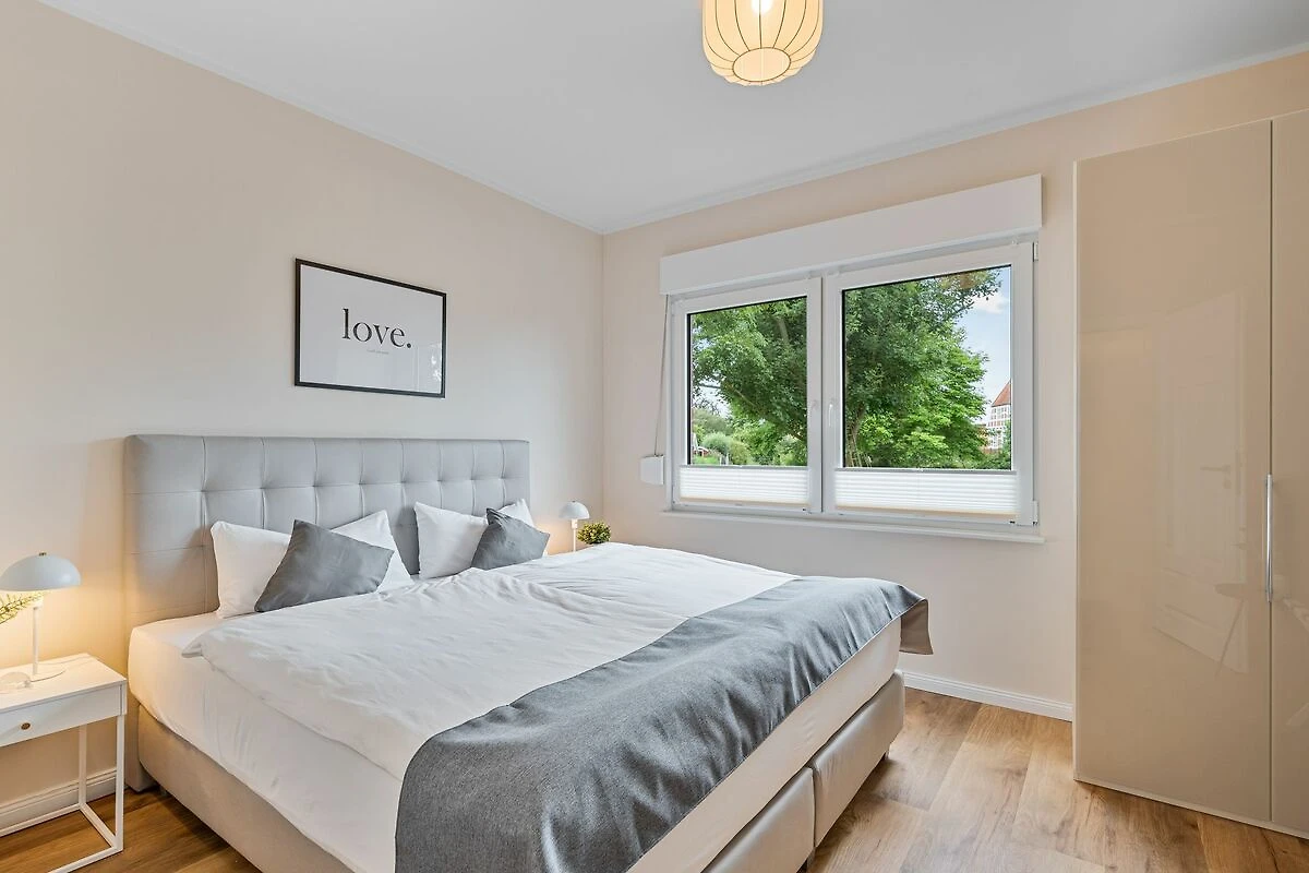 • Schlafzimmer mit Boxspring-Doppelbett (180x200), Smart-TV, Plissees als Sichtschutz, Rolladen zur Verdunkelung