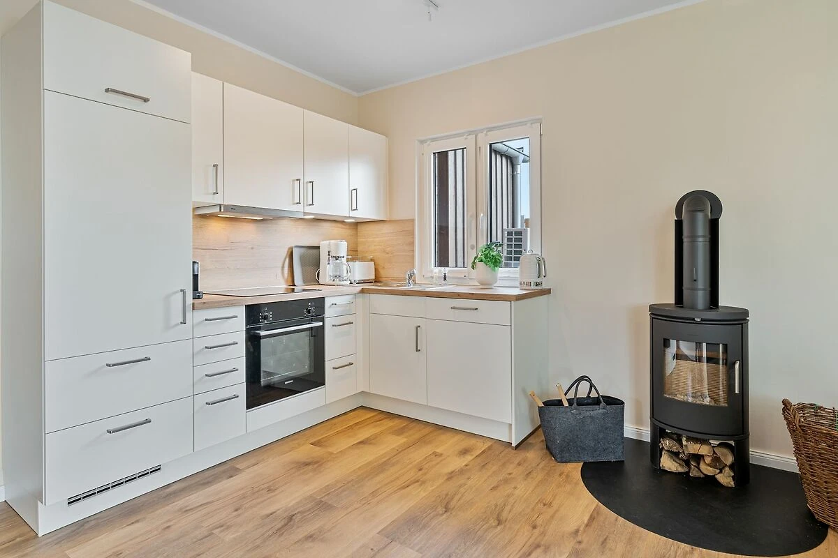 • Wohnraum mit offener Küche, Smart-TV, Radio, Kaminofen, 2 Terrassentüren