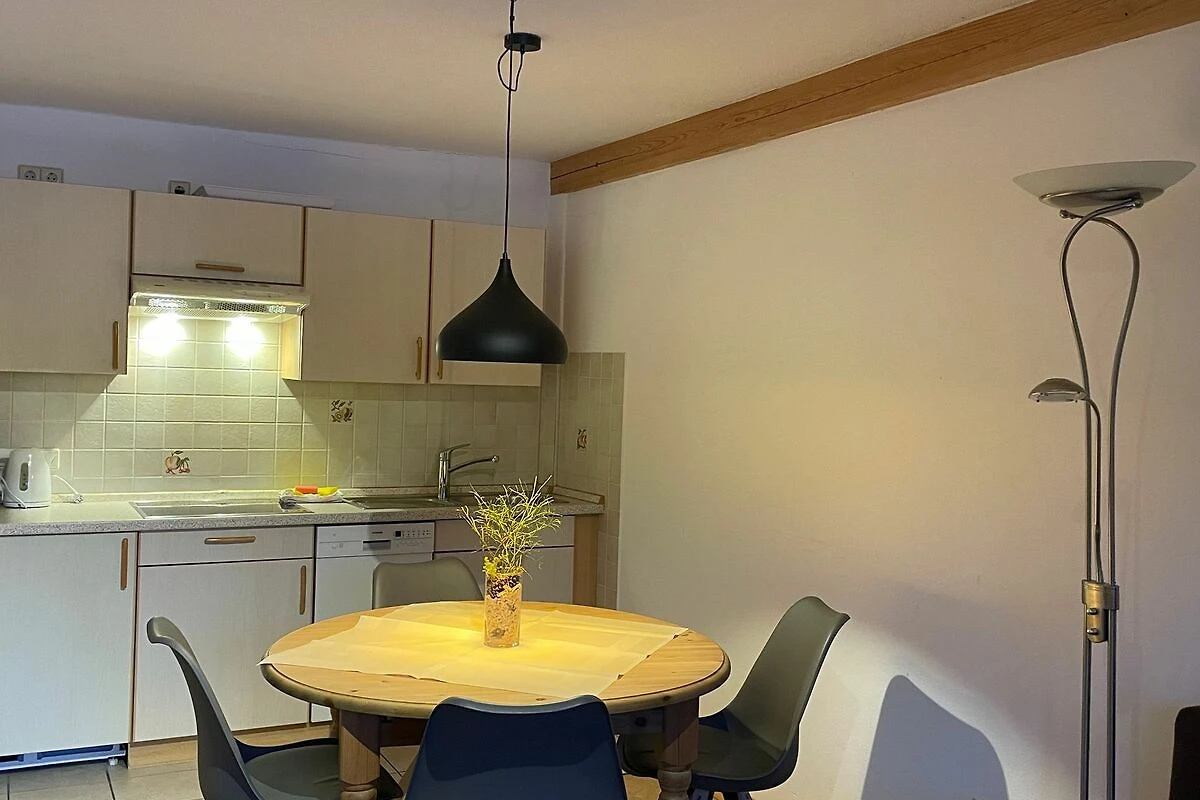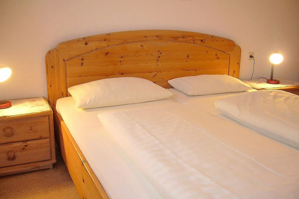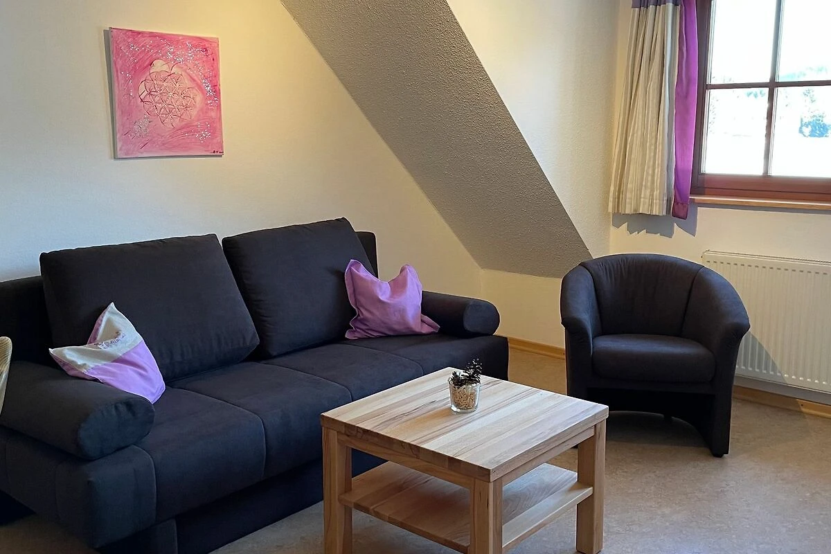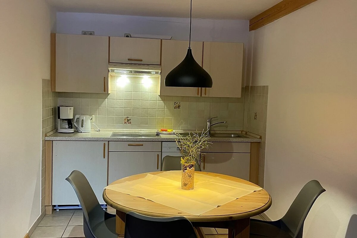 Gemütliche im Besonderen für Allergiker geeignete Ferienwohnung in Holz-Lehmbau ohne Balkon mit Blick zur Kapelle und Hochfirst. 45qm mit Vollholzmöbel aus Kiefer und Linoleum Boden ausgestattet machen das Wohnen angenehm. Die Wohnung verfügt über eine Eingangsdiele mit Zugang zum Badezimmer mit Dusche und WC, zum Schlafzimmer mit Doppelbett und zum Wohn-Essbereich mit Küchenzeile. Die Wohnung kann maximal mit 2 Erwachsenen und einem Kind bis 12 Jahre belegt werden.