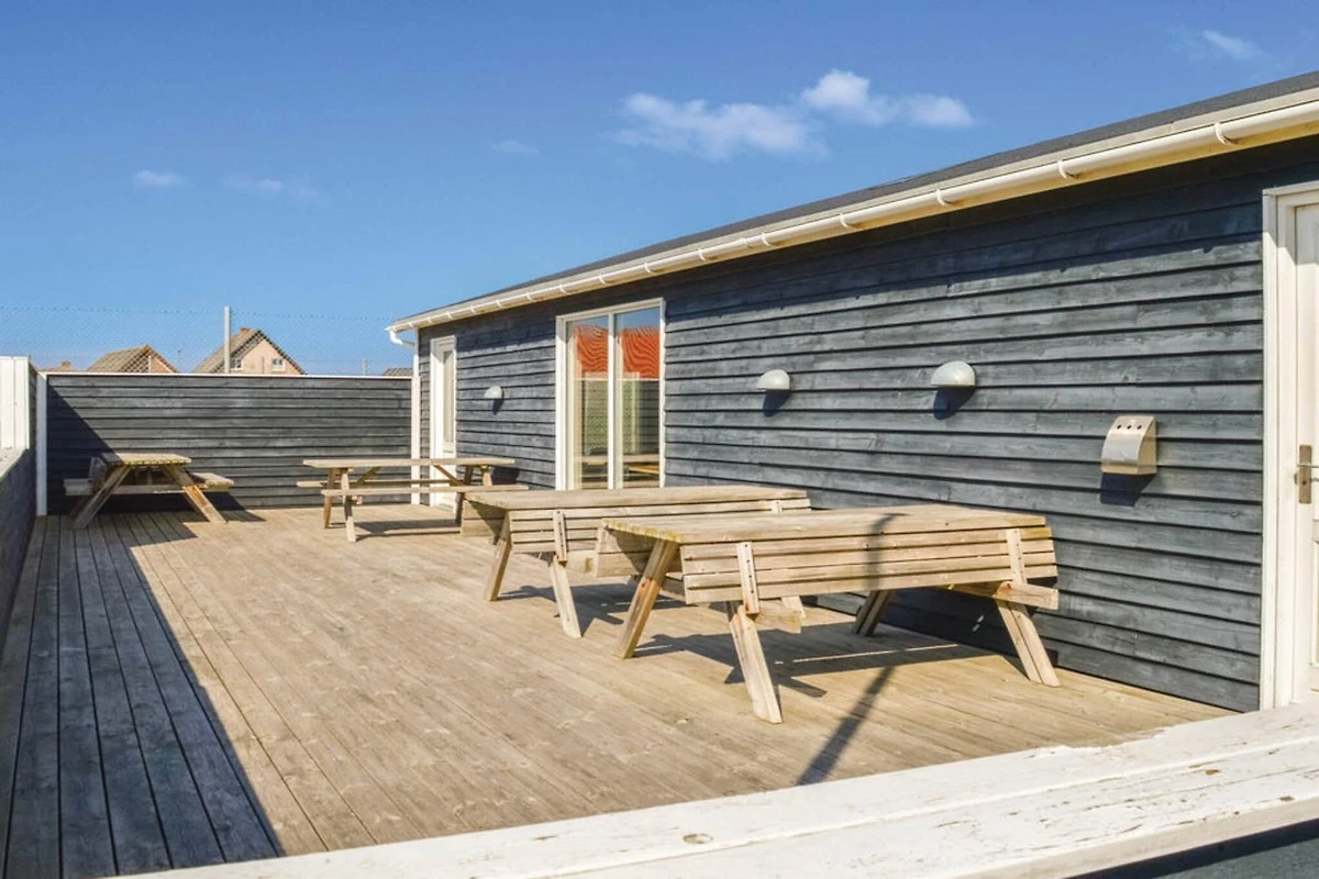 , Wohnzimmer(TV(Deutsch Fernsehsender, dänische Fernsehsender, norwegische Fernsehsender, schwedische Fernsehsender), Stereoanlage), Wohnzimmer(2x Einzelbett), Küche(Kochherd(2 Kochplatten), Kaffeemaschine, Mikrowelle, Kühlschrank(+ Gefrierfach)), Schlafzimmer(Doppelbett), Schlafzimmer(Doppelbett), Badezimmer(Waschbecken, Dusche, Toilette), Heizung(elektrisch), Terrasse, Gartenmöbel, Pool(Gemeinschaftliche Nutzung mit anderen Gästen, im Innenbereich)