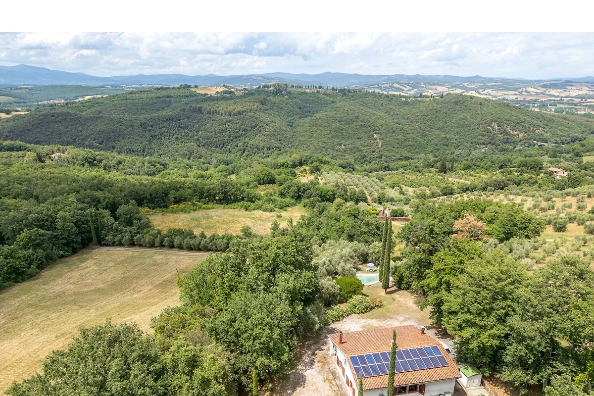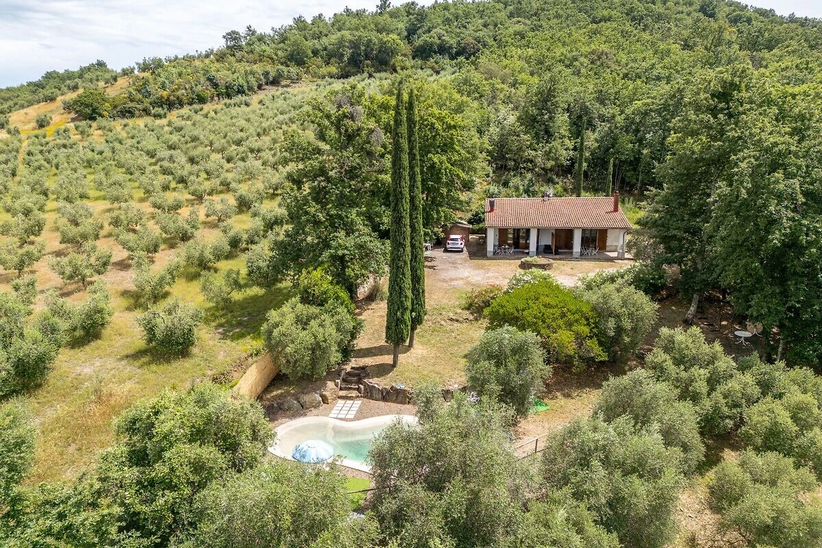 Das gemütliche Ferienhaus mit viel Privatsphäre befindet sich auf einer Anhöhe in wunderschöner Panoramalage, am Waldrand mitten in der ruhigen toskanischen Landschaft, mit Blick auf Olivenbäume, Oleander, Zypressenreihen und mittelalterlichen Dörfern.