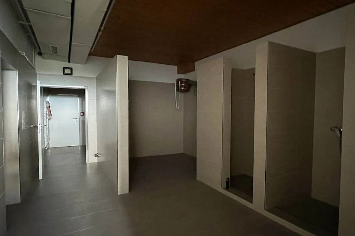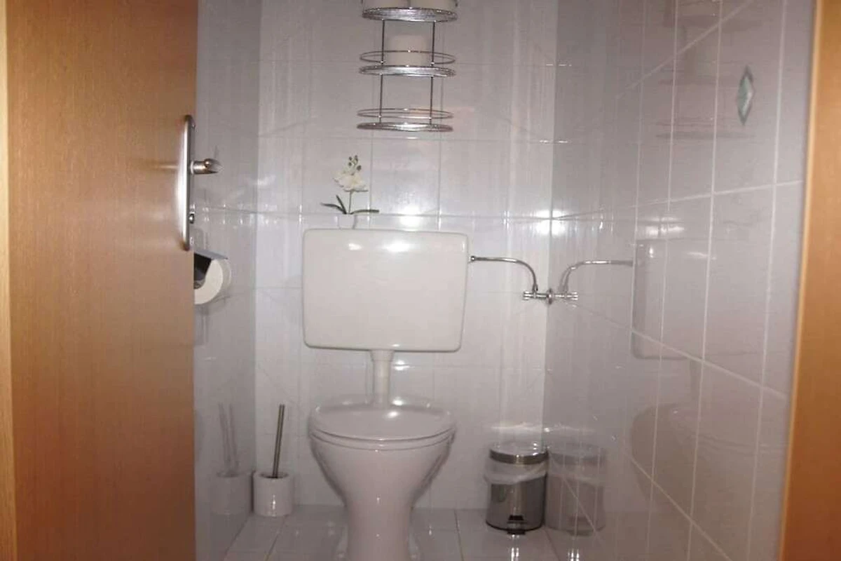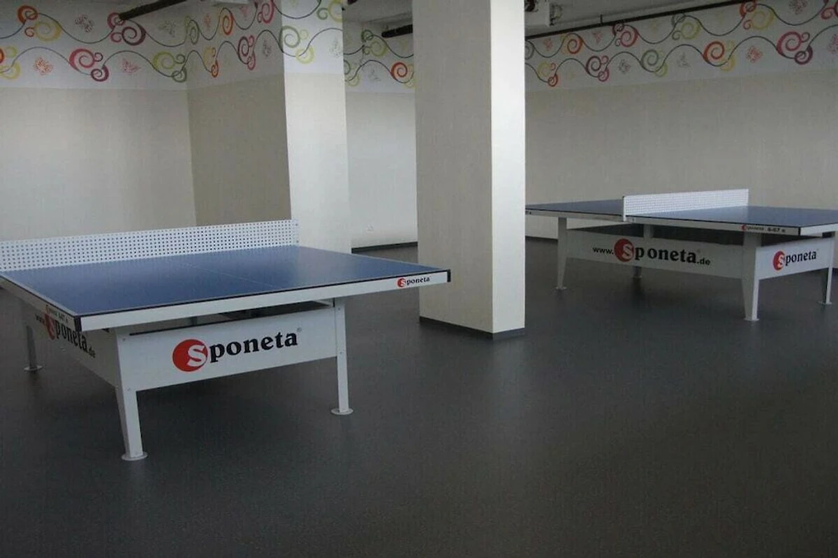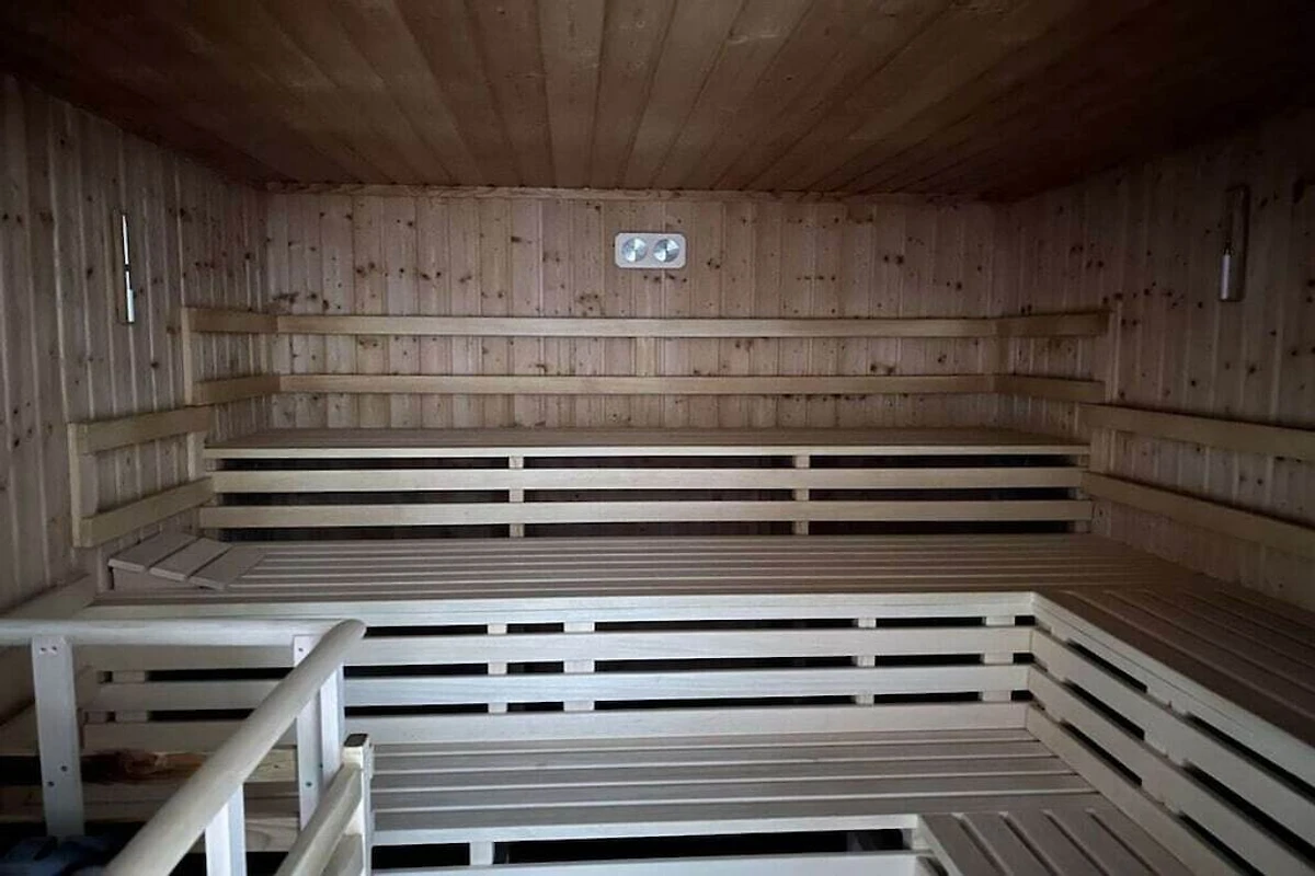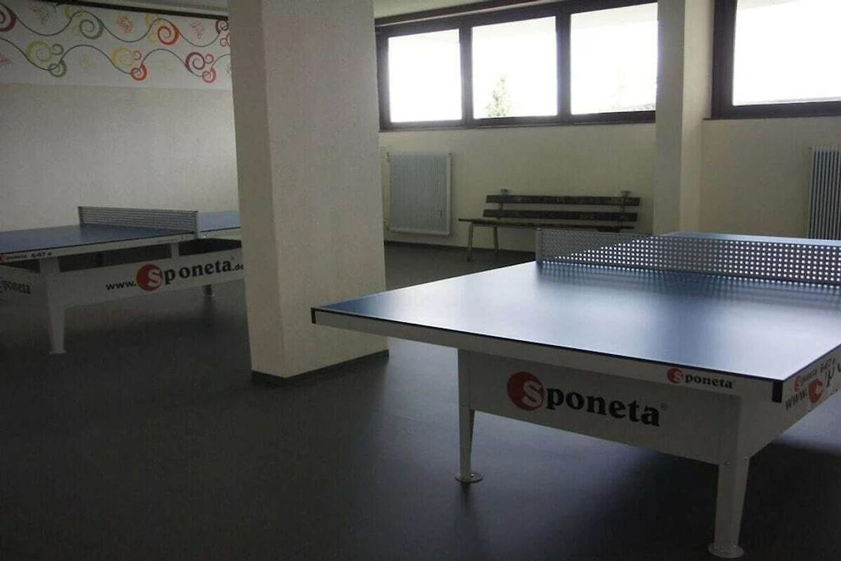 Parterre: (Eingangshalle(, ), Küche(, , Kochnische, Esstisch, Radio, Kochplatte, Wasserkocher, Kaffeemaschine, Backofen, Spülmaschine, Kühlschrank), Schlafzimmer(Doppelbett), Badezimmer(, Dusche, Waschbecken, Föhn), guest toilet(, Waschbecken), Ruheraum(, Sauna, Tischtennis, Pool))