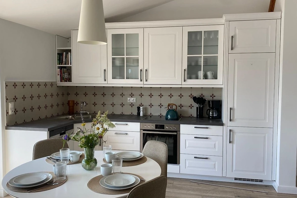 Die neue hochwertige Küche im Landhausstil, beherbergt alles, was ihr Herz begehrt, Backofen ,Induktionsherd, 2 grosse Gefrierfächer und alle nötigen Kochutensilien