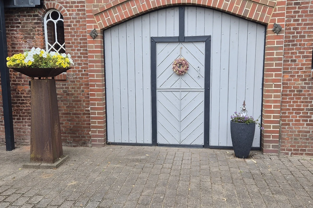 Vom Garten gelangen Sie in den neu errichteten Saunabereich, erbaut im ehemaligen Kuhstall des Resthofes.