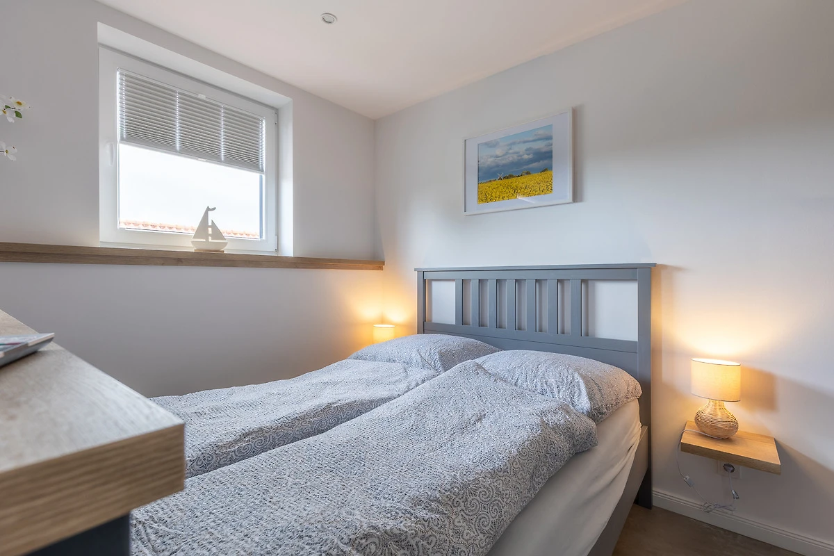 Freuen Sie sich auf ein helles, liebevoll eingerichtetes Zimmer, das modernes Design mit norddeutscher Gemütlichkeit vereint. Hier finden Sie alles, was Sie für entspannte Tage am Meer brauchen: Ein komfortables Bett sorgt für erholsame Nächte, während ein kleiner Sitzbereich zum Lesen, Planen oder einfach zum Durchatmen einlädt. Grosse Fenster lassen viel Tageslicht herein und schaffen eine freundliche, einladende Atmosphäre.