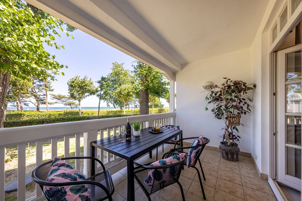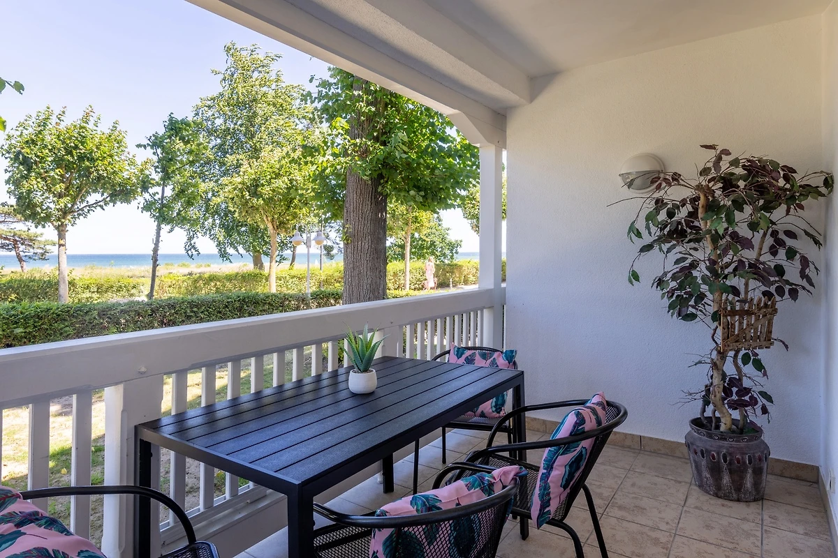 Sowohl vom Wohnzimmer als auch vom komfortabel möblierten Balkon aus genießen Sie einen herrlichen Blick auf das Meer.