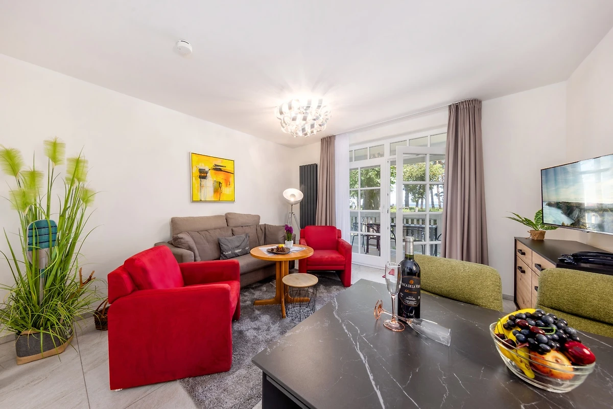 Diese geräumige 1-Raum-Ferienwohnung im Erdgeschoß überzeugt durch eine sehr geschmackvolle Einrichtung. Der Wohnbereich verfügt über einen Smart-TV, kostenloses WLAN sowie einen Essplatz. Die Schlafcouch kann für zwei Kinder oder eine erwachsene Person aufgebettet werden.