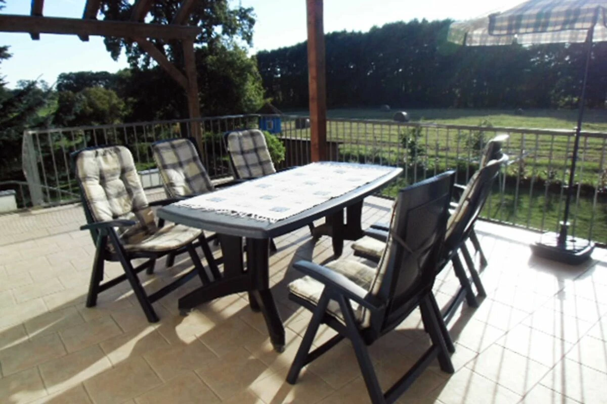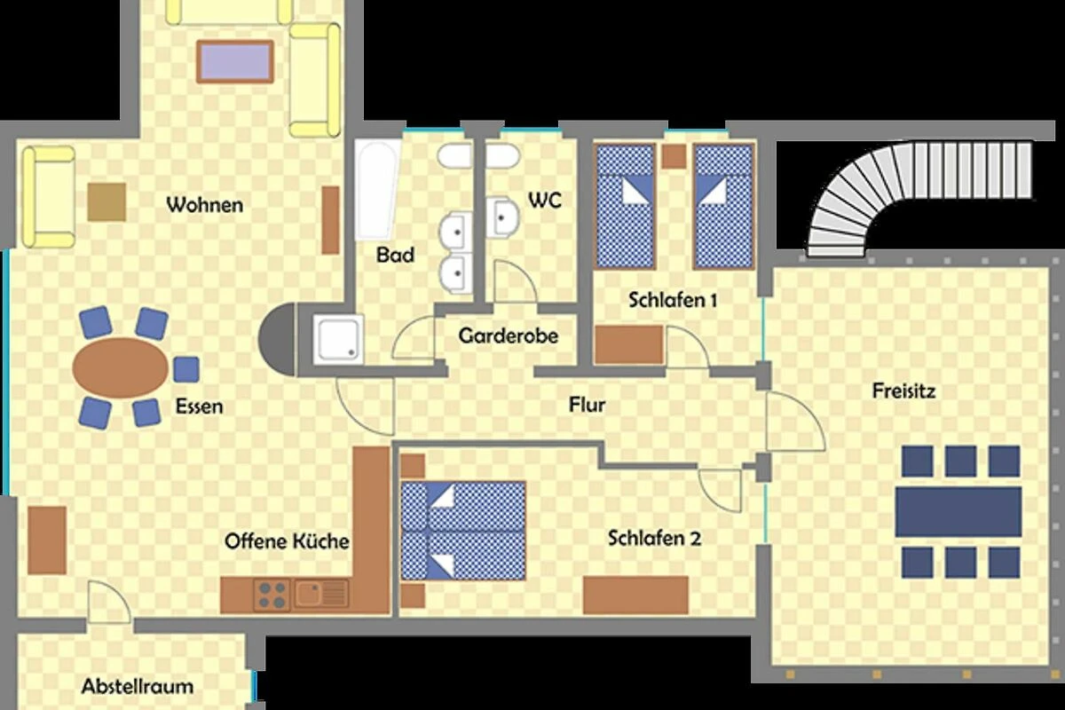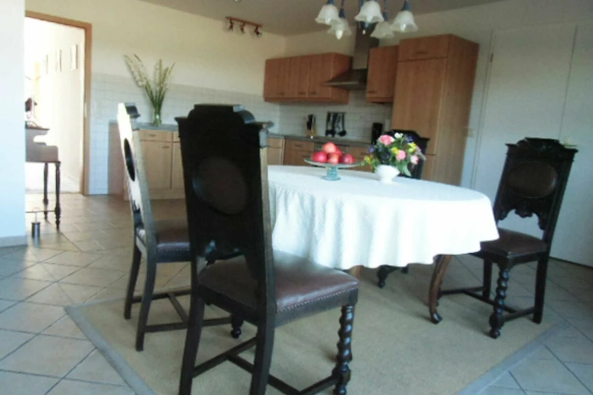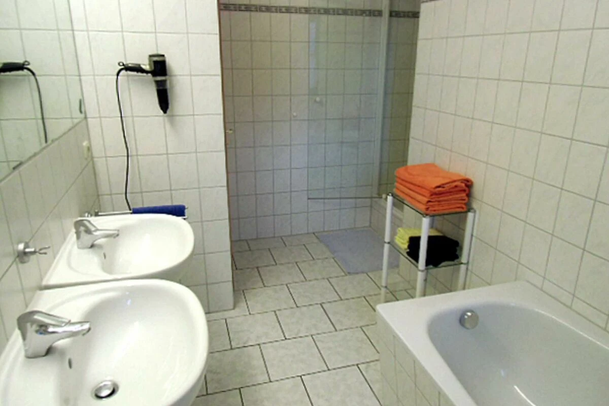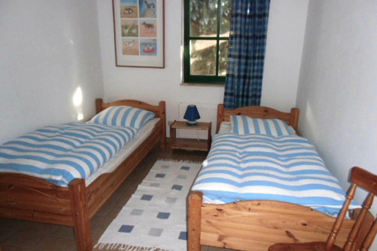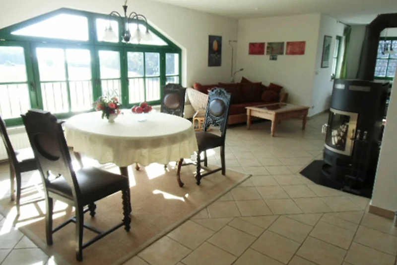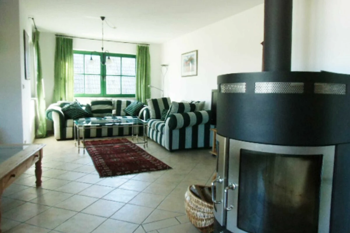 Die Fewo befindet sich im OG in einem Ferienhaus mit insgesamt 3 Fewo. Sie ist ganzjährig zu mieten und für bis zu 6 Personen geeignet. Sie verfügt über eine Wohn/-Küche mit einer Einbauküche (Geschirrspüler), Kamin, einem Schlafzimmer mit Ehebett, einem Schlafzimmer mit 2 Einzelbetten, Dusche/WC (Fön), Gäste WC, einer sonnendurchfluteten Terrasse, TV und Radio. Die Aufbettung für 2 Personen ist im Wohnzimmer möglich. Ein Kinderbett und ein Hochstuhl können auf Anfrage bereitgestellt werden. Eine Waschmaschine und ein Trockner können gegen Gebühr genutzt werden. Sitzecke im Garten und Grillmöglichkeiten vorhanden. Auf dem Grundstück befindet sich ein kostenloser PKW-Stellplatz. Handtücher und Bettwäsche sind nicht im Preis enthalten. Entweder bitte selbst mitbringen oder vor Ort für 8,00 Euro/Person mietbar. Haustiere nach Absprache, pro Haustier 7,00 Euro.