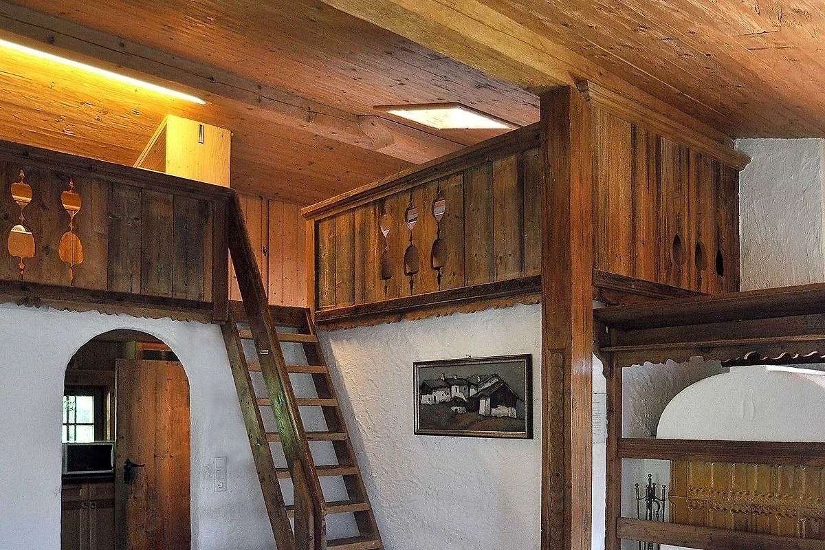 Im unteren Teil der Wohnung befinden sich die Küche, das Badezimmer, eine liebevoll eingerichtete Bauernstube mit Kachelofen und ausziehbarer Schlafcouch (zusätzlicher Schlafplatz für 1 Person). Auf der Glerie im Wohnzimmer gibt es zwei Doppelbetten, welche man über eine Leiter erreicht. Wohn- und Schlafbereich bilden somit zusammen einen schönen grossen Raum mit direktem Zugang zu einem eigenen sonnigen Balkon, von dem Sie einen herrlichen Panoramablick geniessen können.
