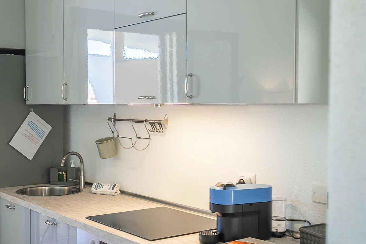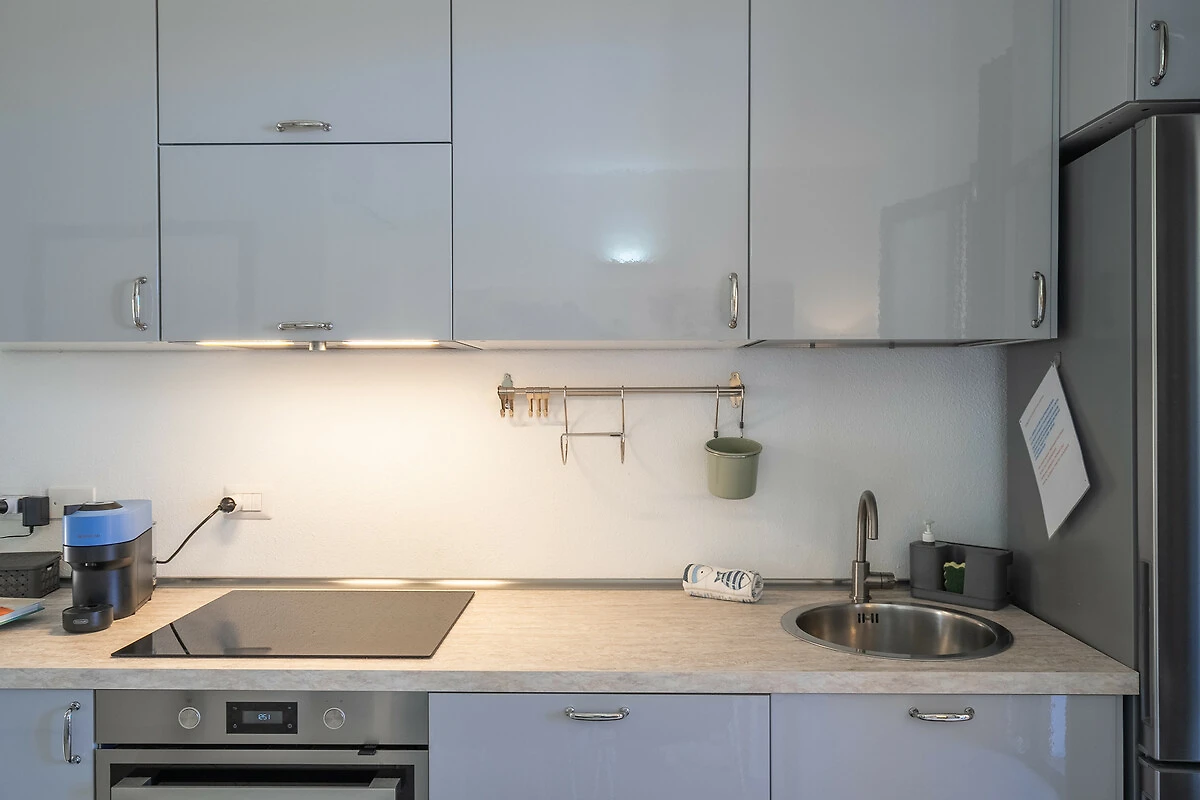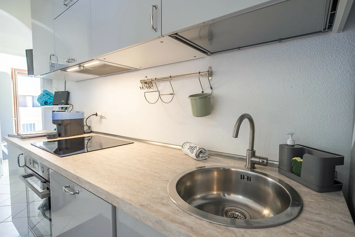Dieses offene küche, mit induktions-kochfeld, ist ausgestattet in kühlschrank, backofen, gefrierschrank, geschirr/besteck, kochutensilien, kaffeemaschine, toaster, wasserkocher und saftpresse.