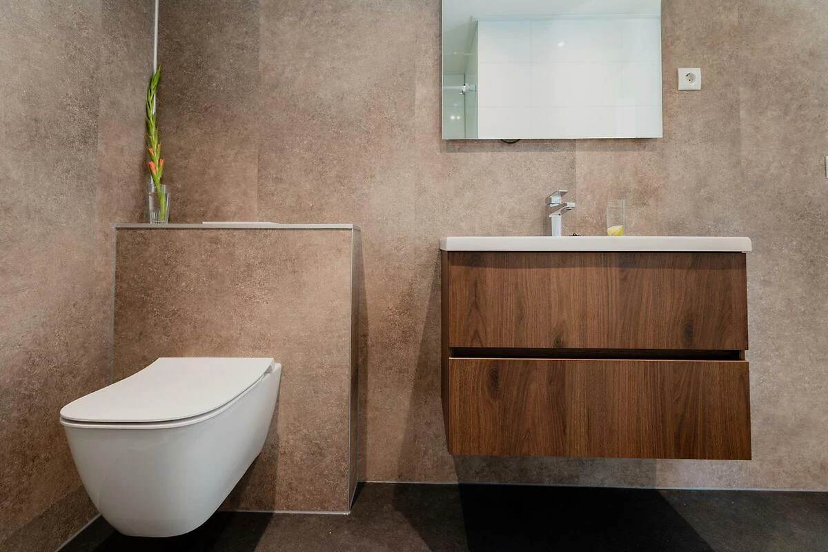 Das geräumige Badezimmer ist mit hochwertigen Materialien ausgestattet und verfügt über eine Regendusche und Doppelwaschbecken. Ein separates WC ist vorhanden.