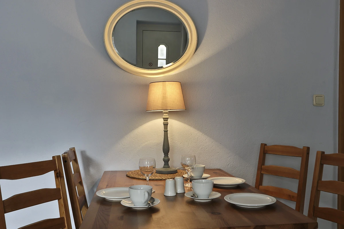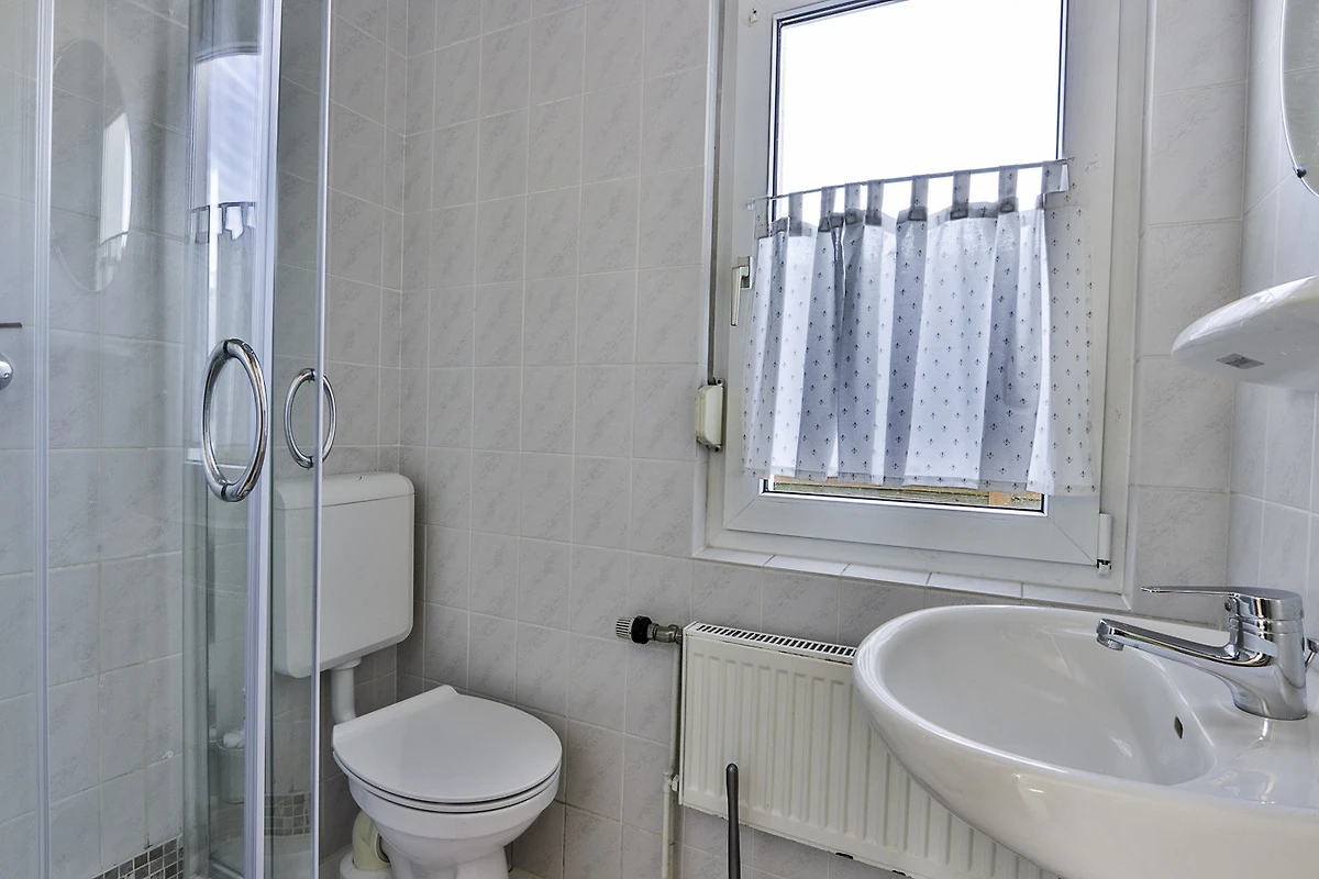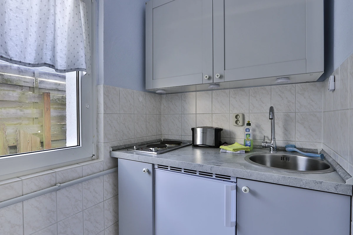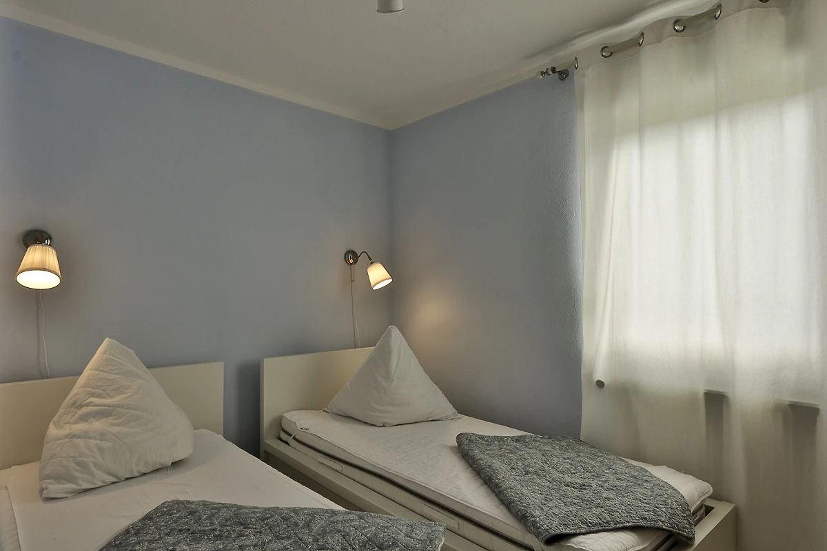 Jede Bungalowhälfte verfügt über ein gemütliches Wohnzimmer mit Couch, Fernseher mit DVD Player. Das Elternschlafzimmer hat 1 Dpoppelbett 140 x 200 cm und das Kinderzimmer hat 2 Einzelbetten. Das Duschbad ist mit Fenster ebenso die kleine Küche mit Pantry, Kühlschrank und alle Dinge die man zum tägliche Gebrauch benötigt. Alle Fenster haben Aussenrollläden.