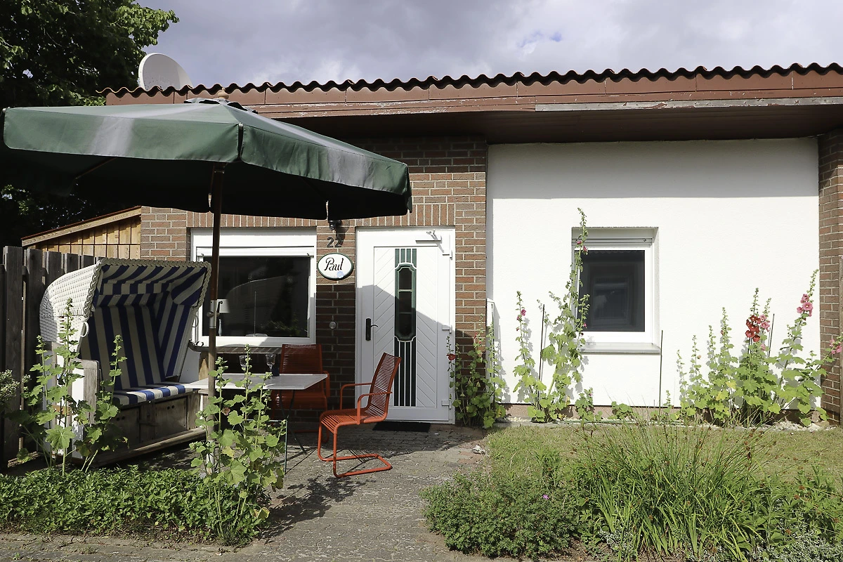 Traumhaft im Grünen gelegener Doppelbungalow "Paul und Paula" mit Terrasse und Garten, Terrassenmöbel, Sonnenschirm und Strandkorb laden zum entspannen ein.