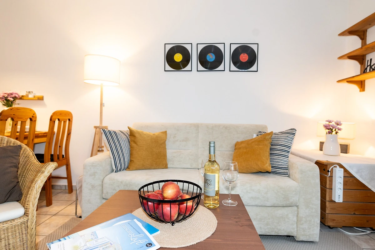 Das freundliche Wohnzimmer bietet Ihnen eine Schlafcouch, einen Esstisch mit Platz für bis zu 4 Personen und einen Curve-TV, der zu entspannten Abenden einlädt. Erholen Sie sich nach einem aufregenden Urlaubstag auf dem Balkon.