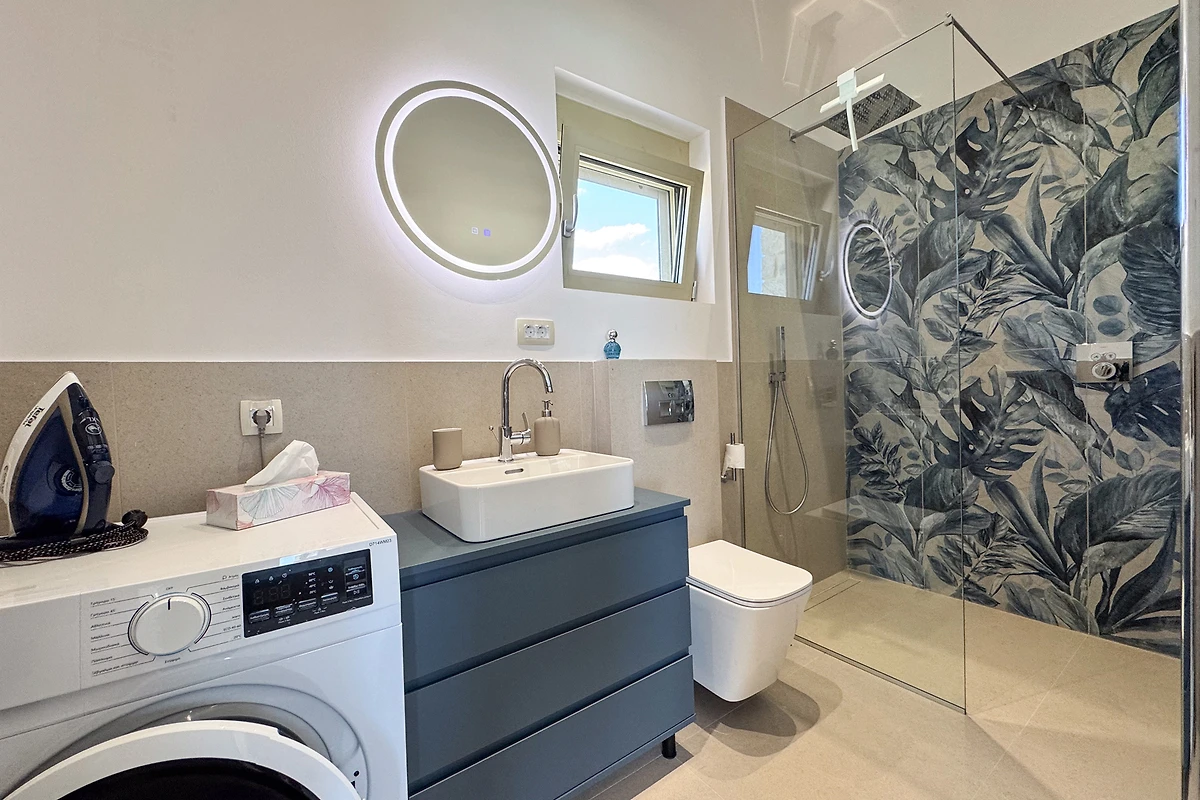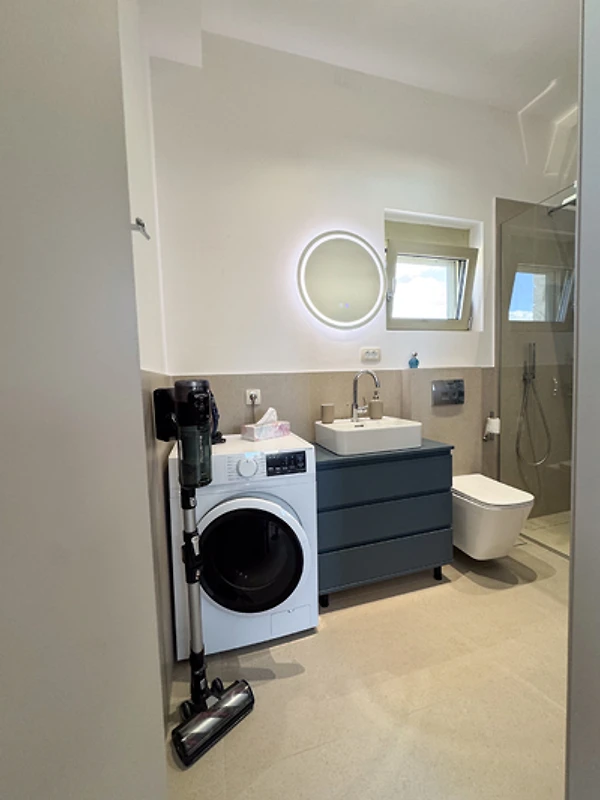 Im Erdgeschoss erwartet Sie eine großzügige Wohnküche mit gemütlicher Couchecke, die bei Bedarf als Schlafsofa genutzt werden kann. Ergänzt wird dieser Bereich durch ein großes Badezimmer mit Dusche sowie Waschmaschine, was den Aufenthalt besonders angenehm macht.