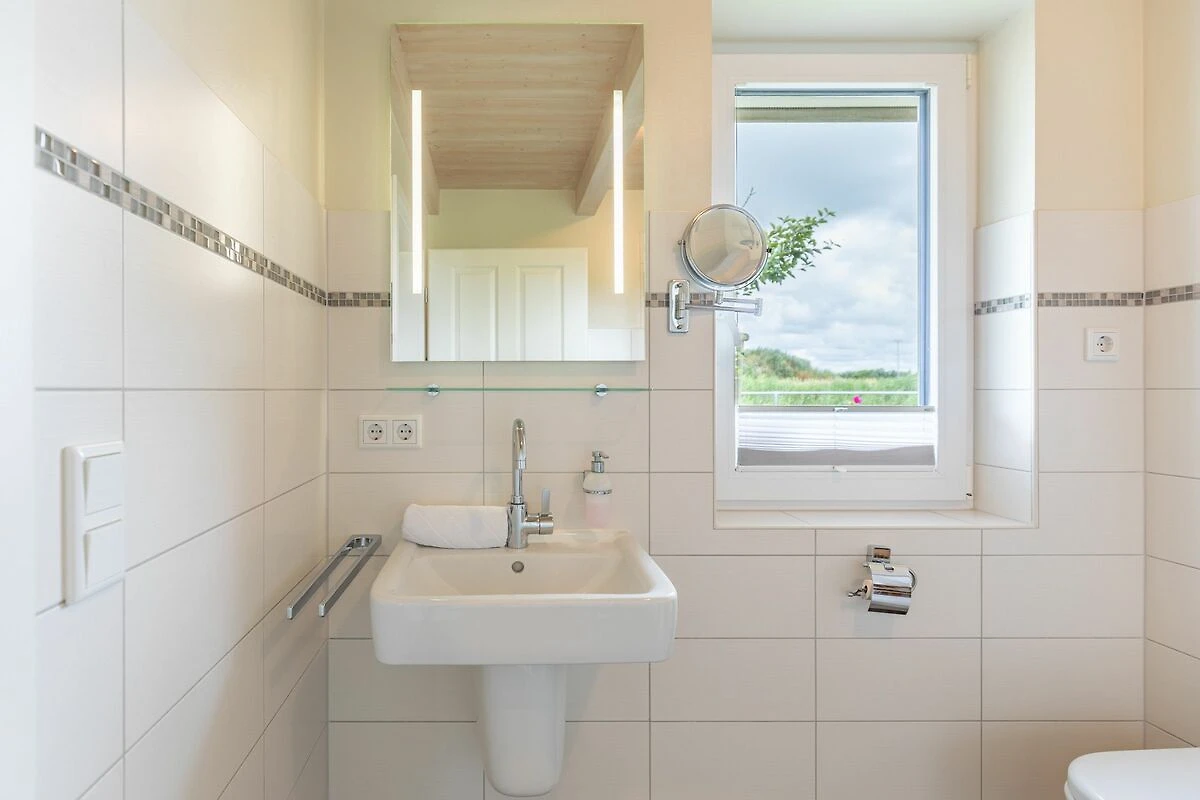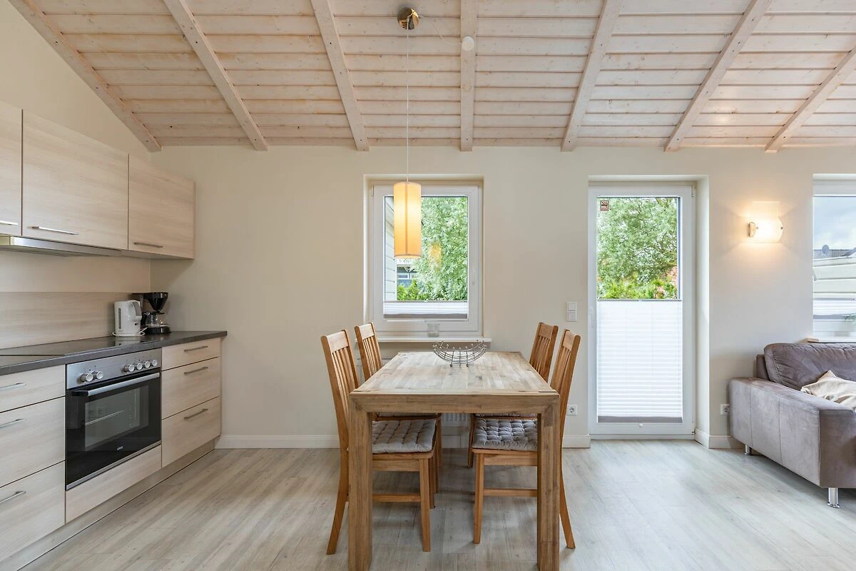 Auf der Terrasse können Sie auf bequemen Gartenstühlen und Liegen entspannte Stunden in der Sonne genießen. Von Ostern bis Oktober steht Ihnen hier außerdem ein gemütlicher Strandkorb zur Verfügung. Für zusätzlichen Komfort sorgt eine Waschmaschine im Haus. Eine kostenfreie E-Ladestation ermöglicht es Ihnen, auch im Urlaub rundum mobil zu bleiben.