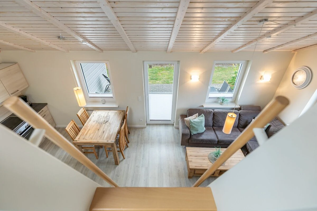 Das 50 m² große Ferienhaus überzeugt mit modernem Komfort und stilvollem skandinavischem Charme. Im Schlafzimmer erwartet Sie ein komfortables Doppelbett (180 × 200 cm), das für erholsame Nächte sorgt. Die Fenster sind mit Fliegengitter versehen. Das gemütliche Wohnzimmer ist mit einer bequemen Sofaecke und SAT-TV ausgestattet. An kühleren Tagen schafft der Kaminofen eine behagliche Atmosphäre.