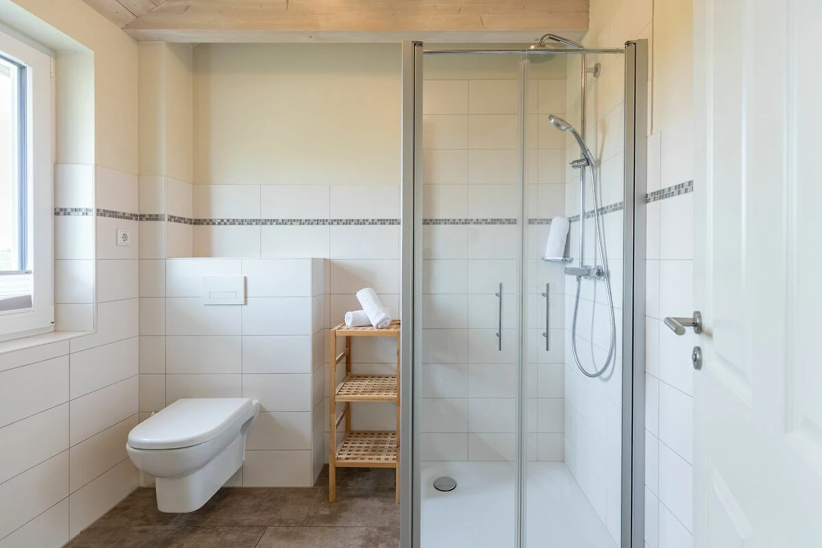 Die offene Küche bietet eine hochwertige und umfangreiche Ausstattung, die das Herz eines jeden Hobbykochs höherschlagen lässt. Sie verfügt über ein Cerankochfeld mit vier Platten, einen Backofen, einen Kühlschrank mit ***Gefrierfach, eine Mikrowelle, einen Geschirrspüler, eine Filterkaffeemaschine sowie viele weitere praktische Küchenutensilien. Das moderne Duschbad mit Fußbodenheizung rundet das stilvolle Gesamtbild des Hauses ab.