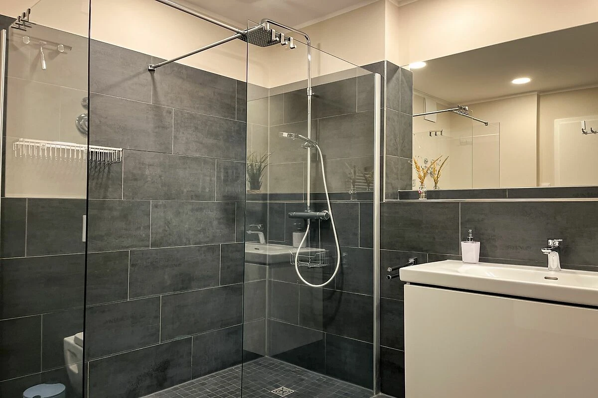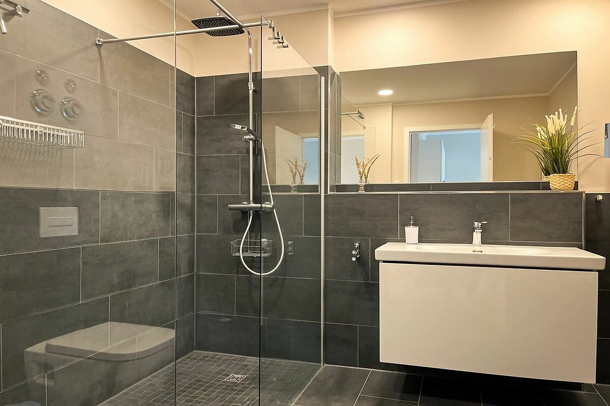 Das Badezimmer ist modern gestaltet und bietet eine bodengleiche Dusche, WC, Waschbecken, Kosmetikspiegel und Haartrockner – ideal für einen angenehmen Start in den Tag.