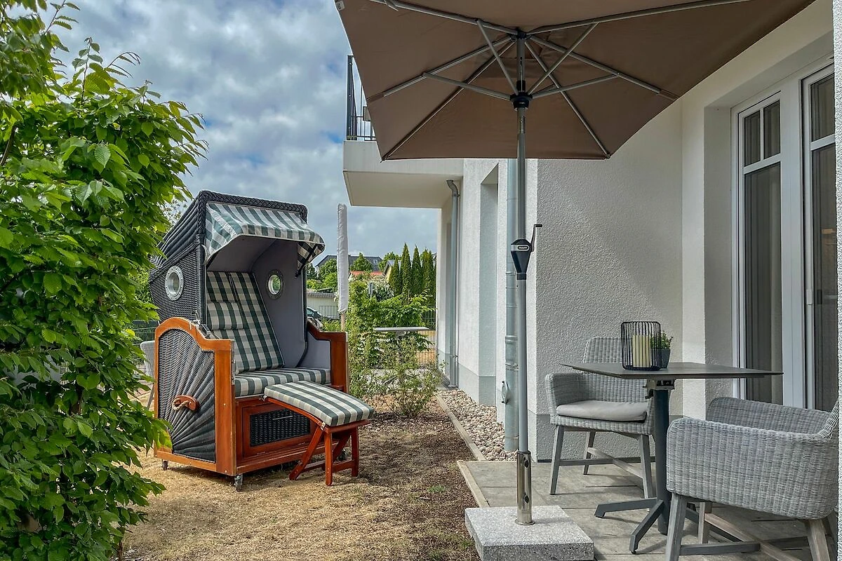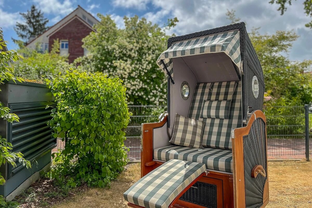 Ein echtes Plus ist die Terrasse mit Gartenmöbeln und Strandkorb – perfekt für ein Frühstück an der frischen Luft oder ruhige Stunden im Freien.