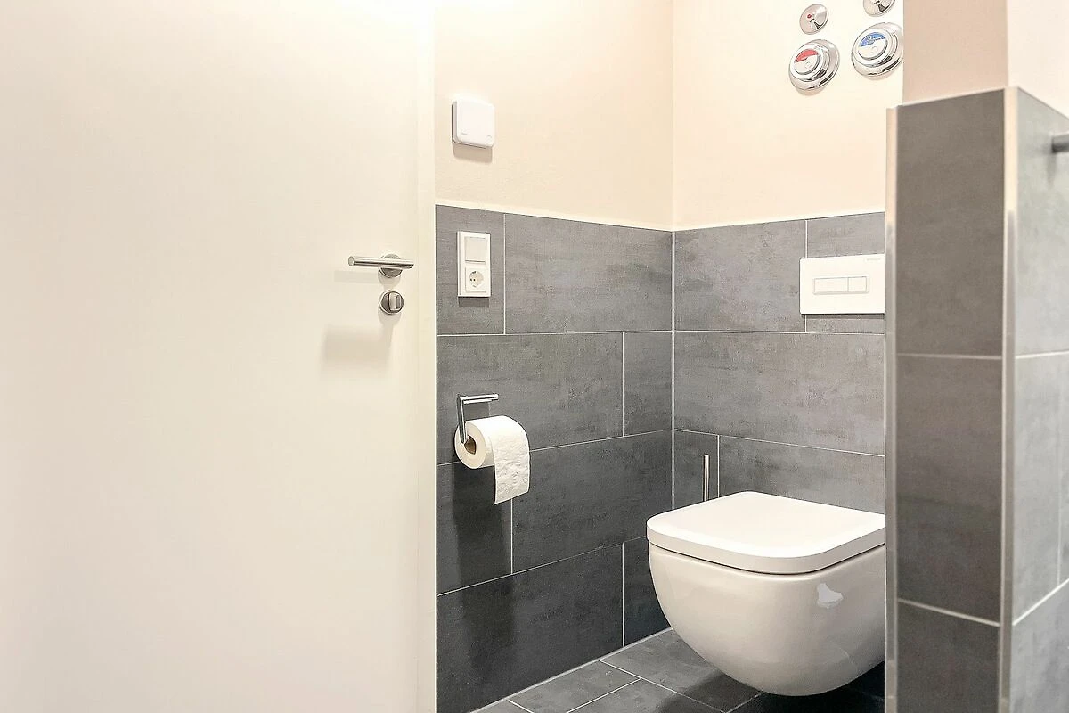 Das moderne Badezimmer verfügt über eine bodengleiche Dusche, WC, Waschbecken, Kosmetikspiegel und Haartrockner – optimal für Deinen Start in den Tag.