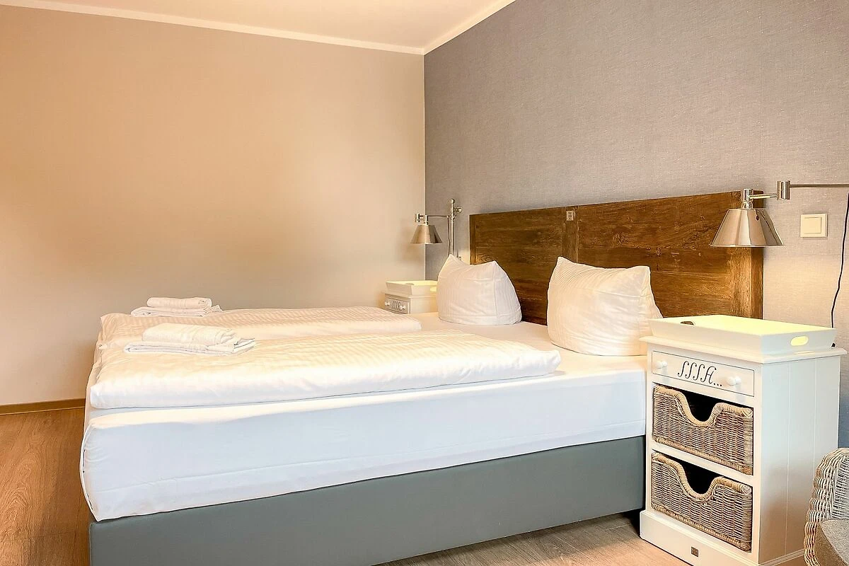Im separaten Schlafzimmer sorgt ein komfortables Doppelbett (2x 90x200 cm) für erholsamen Schlaf.
