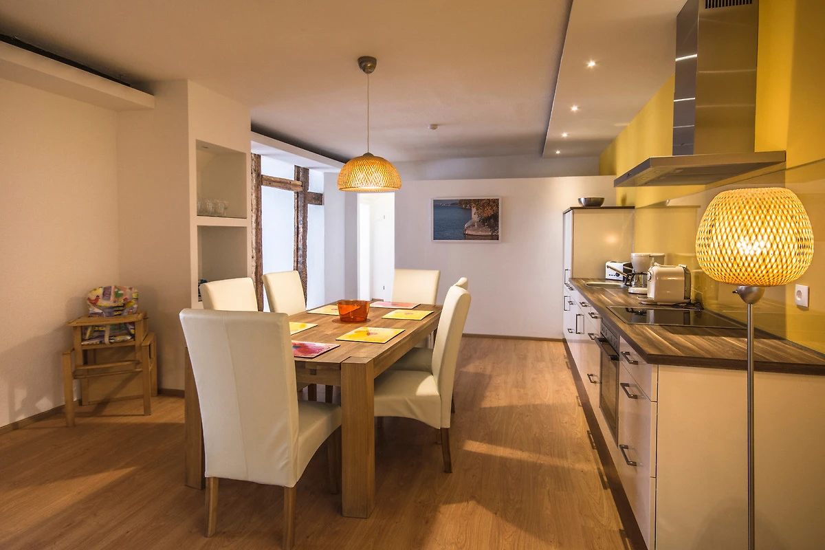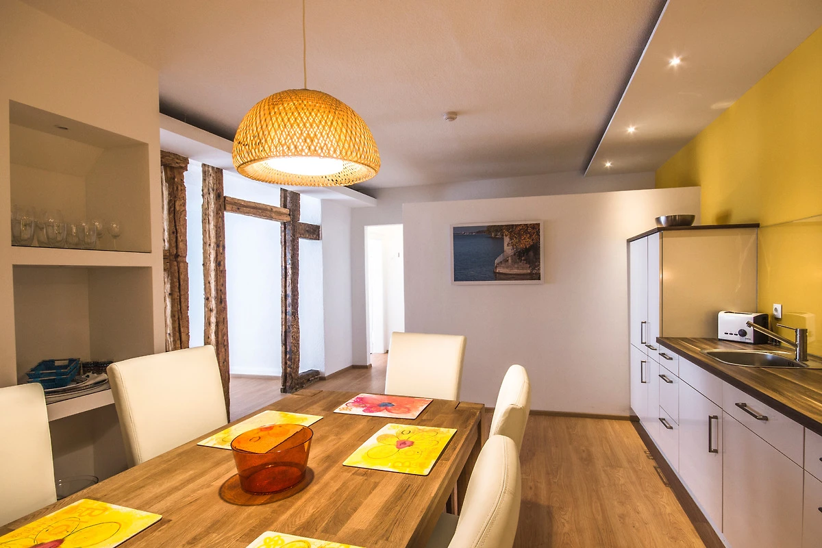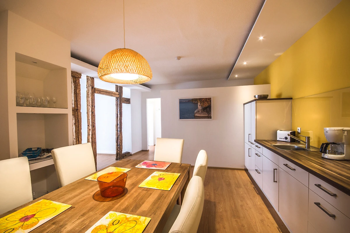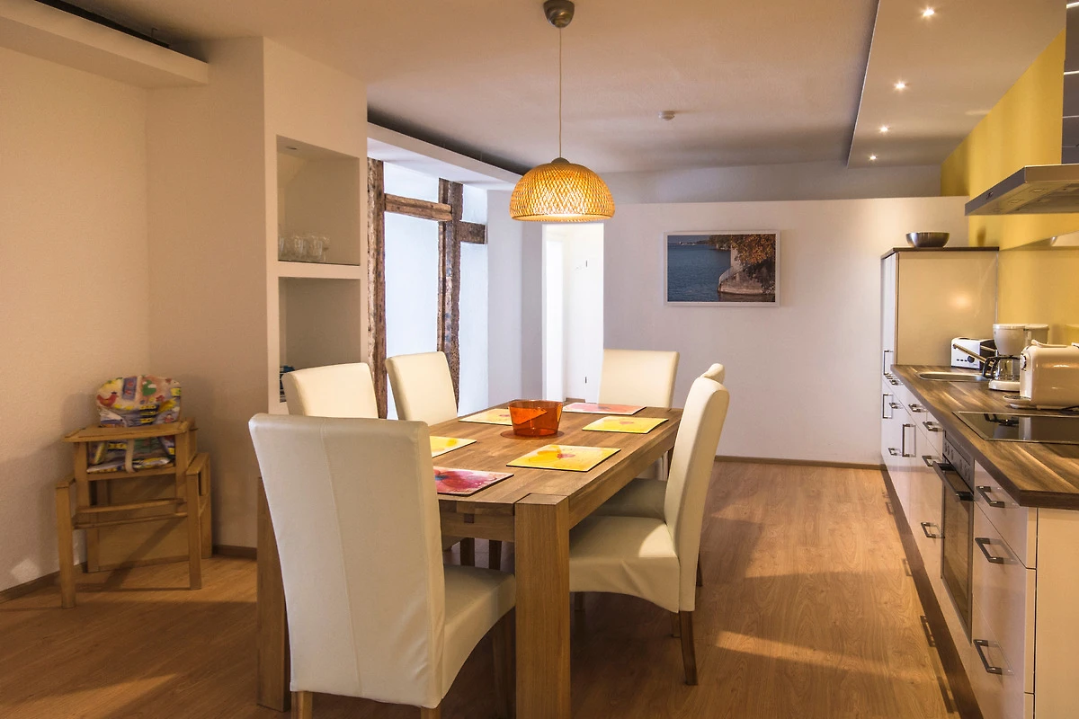 Im geschmackvoll eingerichteten Koch- und Essbereich sitzen Sie an der ausladenden Tafel in der Mitte des Raumes. Historisches Fachwerk bildet den Übergang zum Wohnzimmer mit gemütlicher Couchlandschaft.