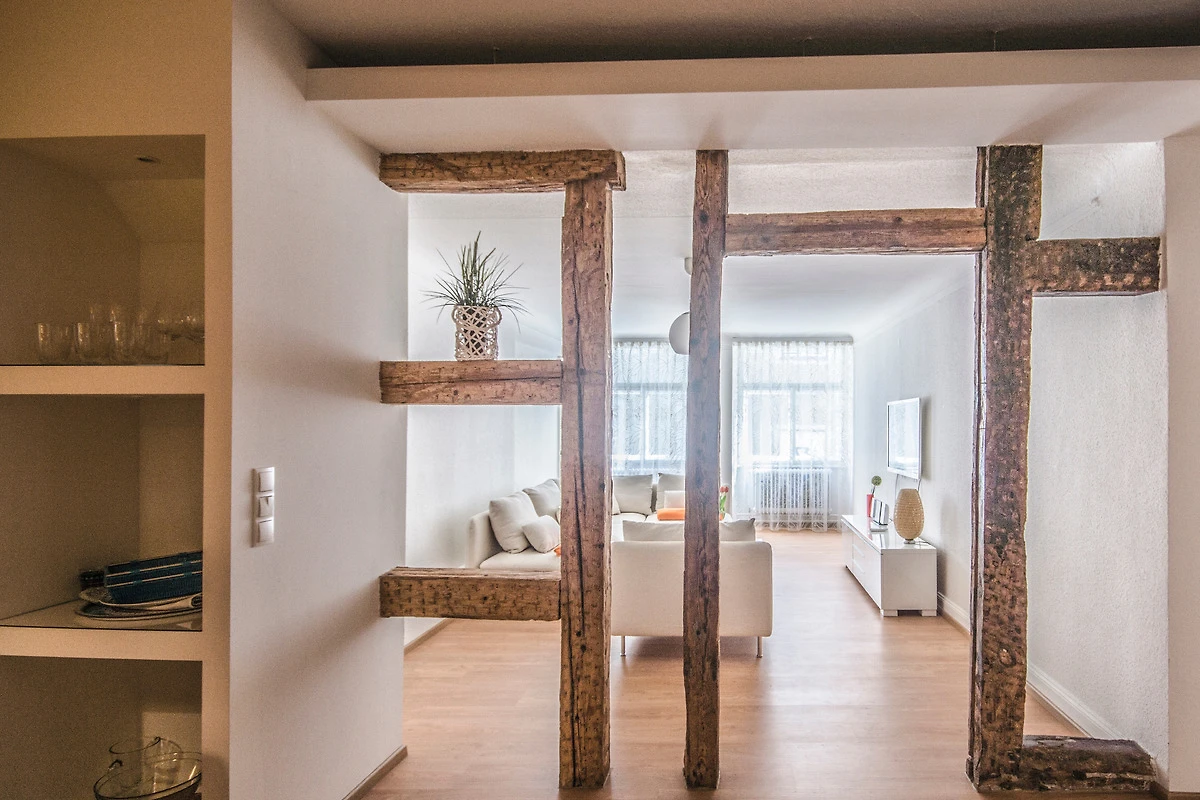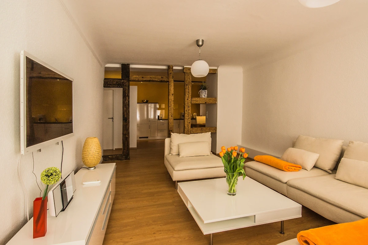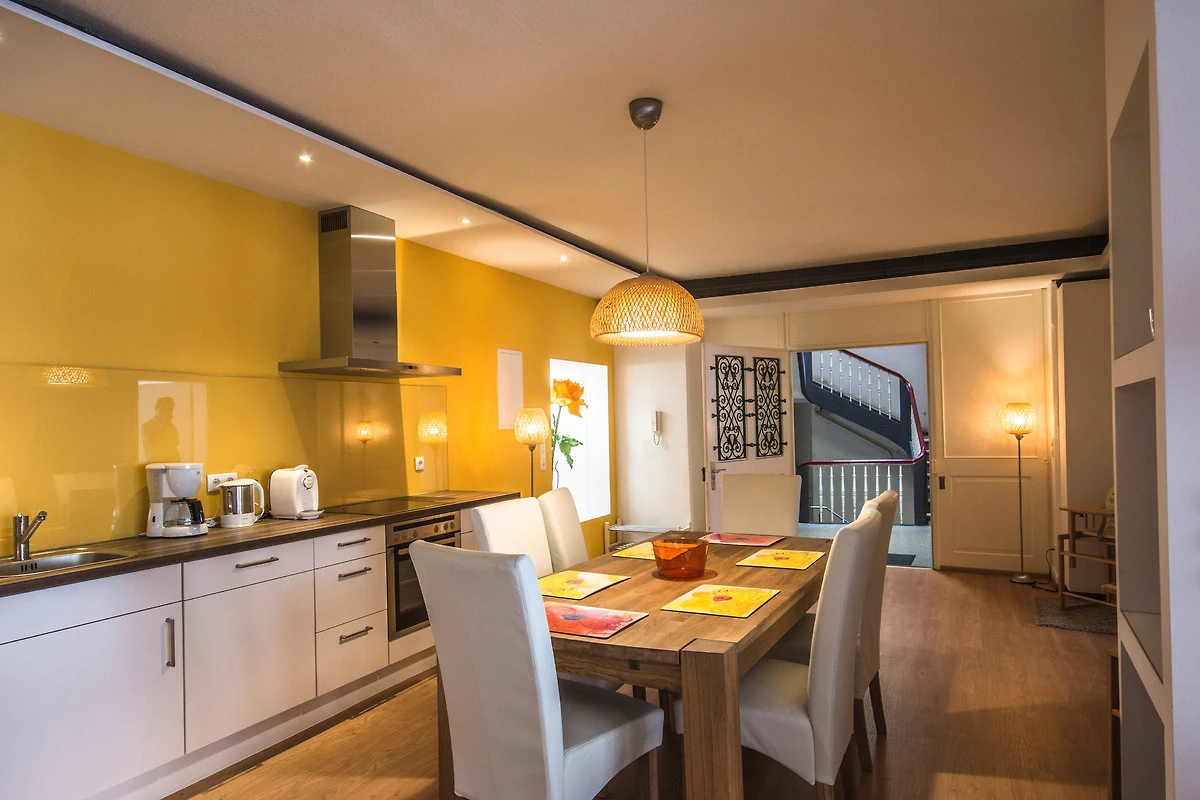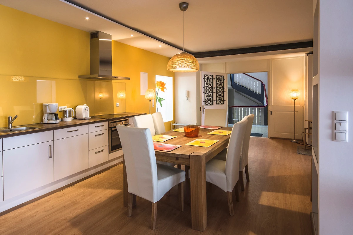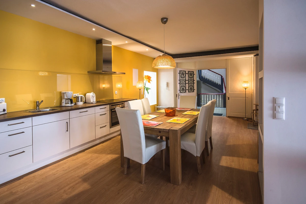 Im geschmackvoll eingerichteten Koch- und Essbereich sitzen Sie an der ausladenden Tafel in der Mitte des Raumes. Historisches Fachwerk bildet den Übergang zum Wohnzimmer mit gemütlicher Couchlandschaft.