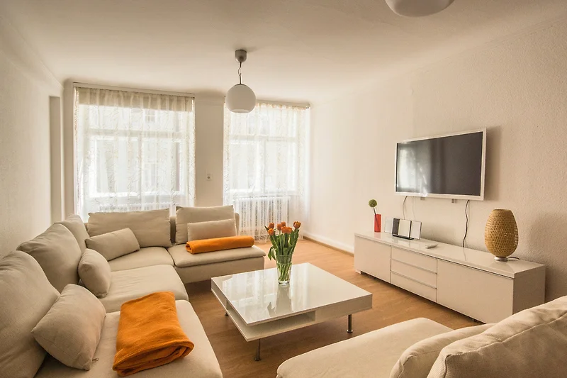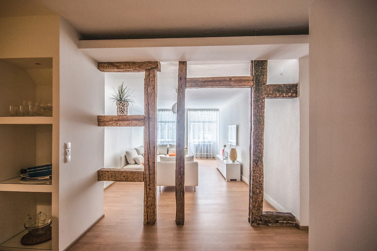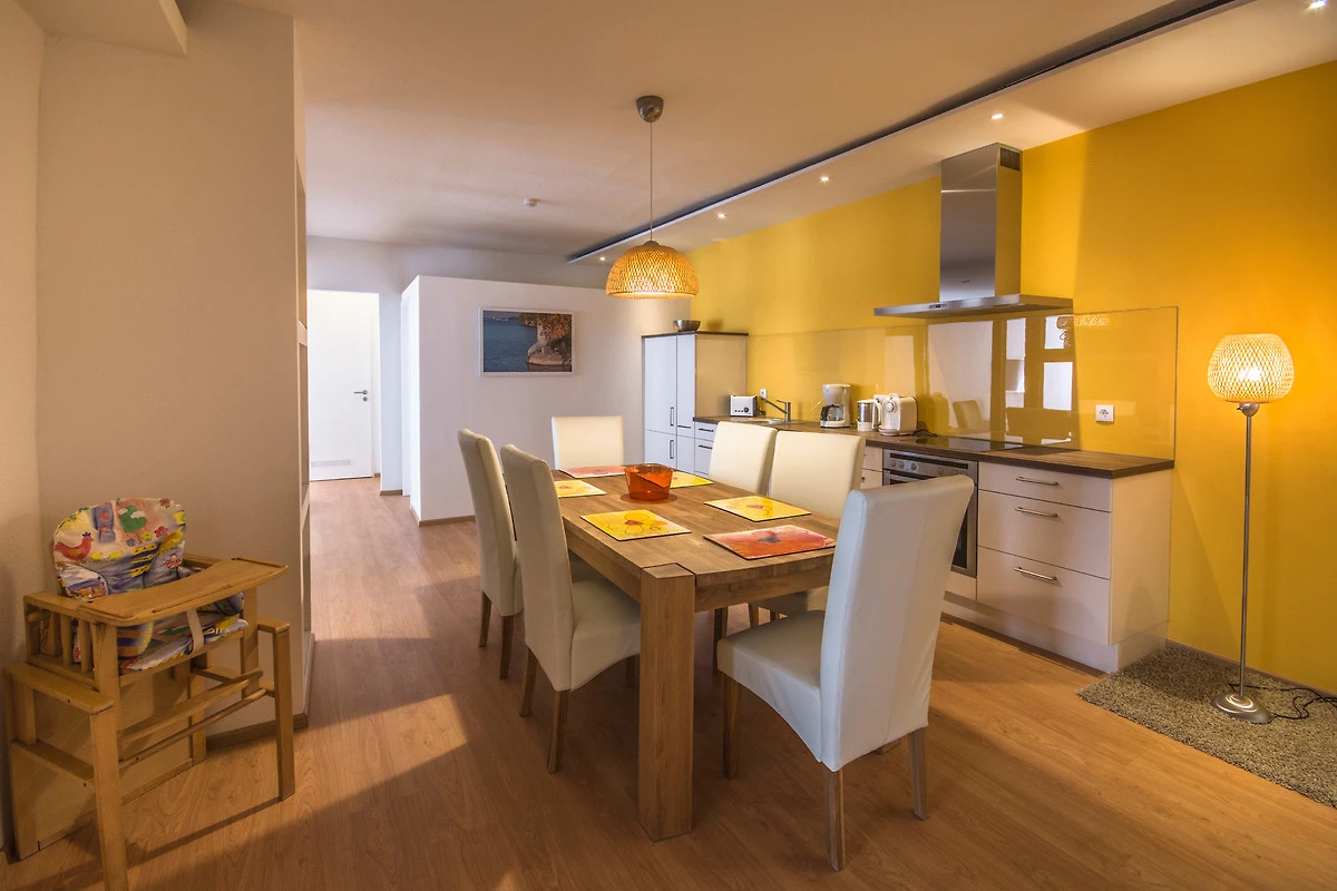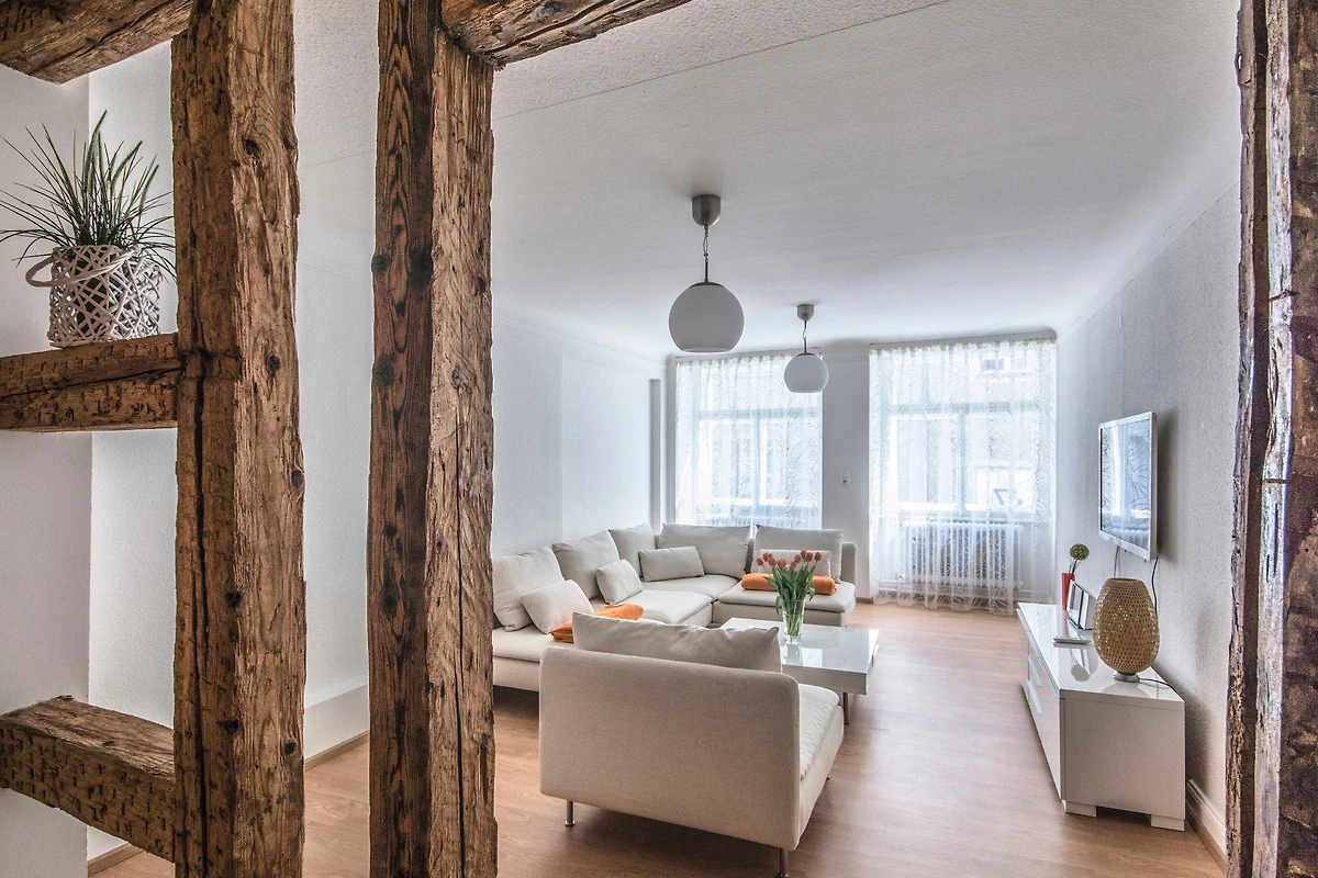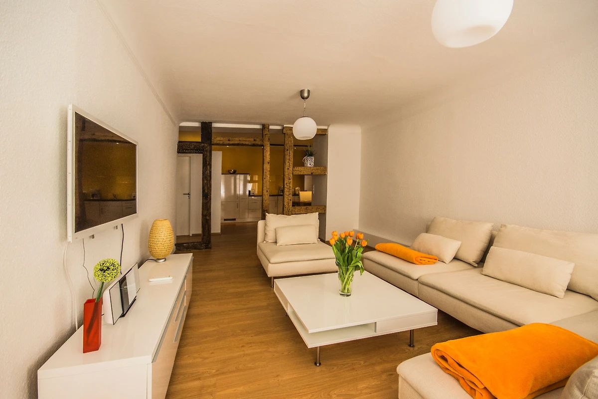 Im geschmackvoll eingerichteten Koch- und Essbereich sitzen Sie an der ausladenden Tafel in der Mitte des Raumes. Historisches Fachwerk bildet den Übergang zum Wohnzimmer mit gemütlicher Couchlandschaft.