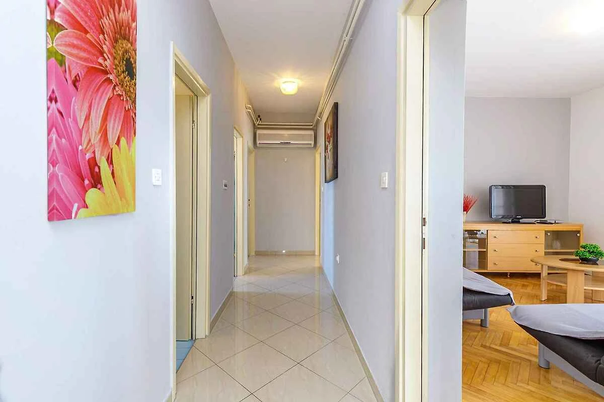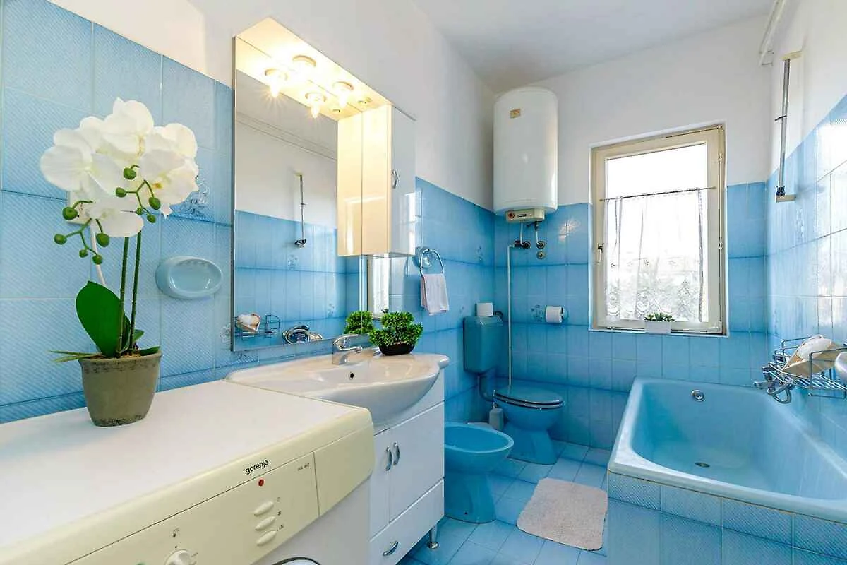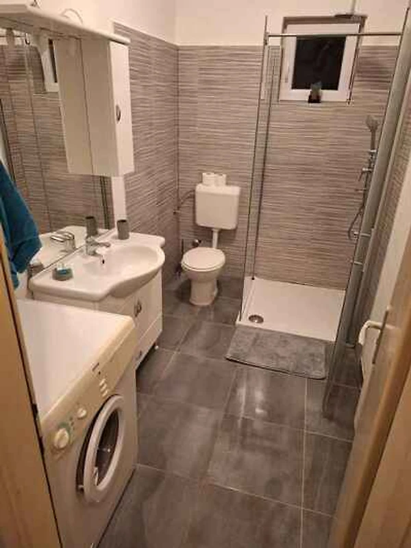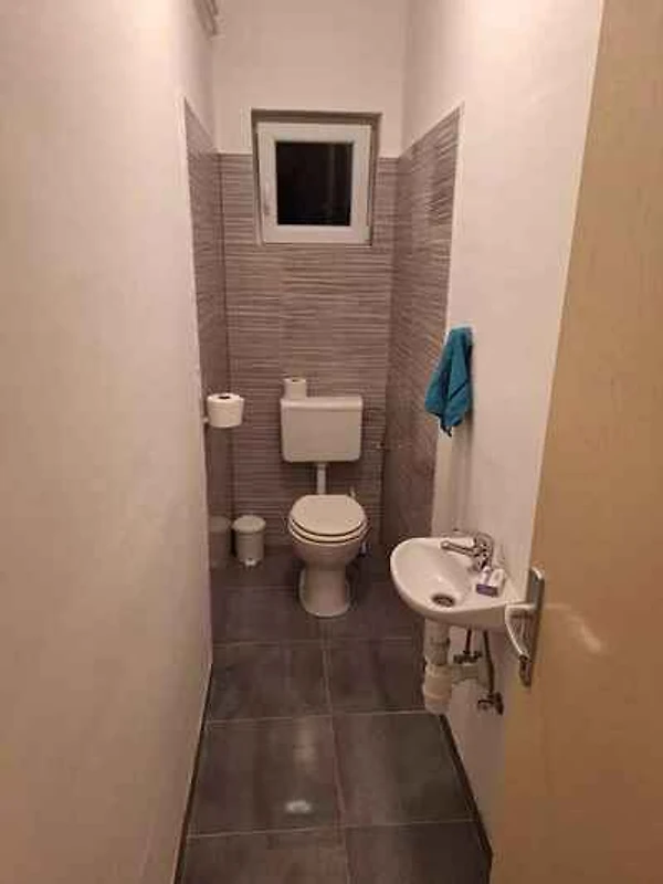 Der Eingang in Ihre Ferienwohnung befindet sich in der 2. Etage und führt über eine Innentreppe direkt in den Flur. Wohnzimmer mit 2 Zusatzbetten auf Couch/Sofa, TV, Essecke (6 Plätze), Zugang zum Balkon (Gartenmöbel, 1 Tisch, 8 Stühle, Sonnenschirm) und air conditioning in the hallway. 2 Schlafzimmer jeweils mit 1 Doppelbett. Schlafzimmer mit 2 Einzelbetten. Küche mit Gasherd (3 Flammen), Elektroherd (1 Platte), Backofen, Dunstabzugshaube, Geschirrspüler, Kühlschrank (Eisfach), Mikrowelle und elektrischem Wasserkocher. Bad mit Badewanne, Waschmaschine, 1 Waschbecken, WC, Bidet und Fenster. Separates WC mit 1 Waschbecken, WC und Fenster.